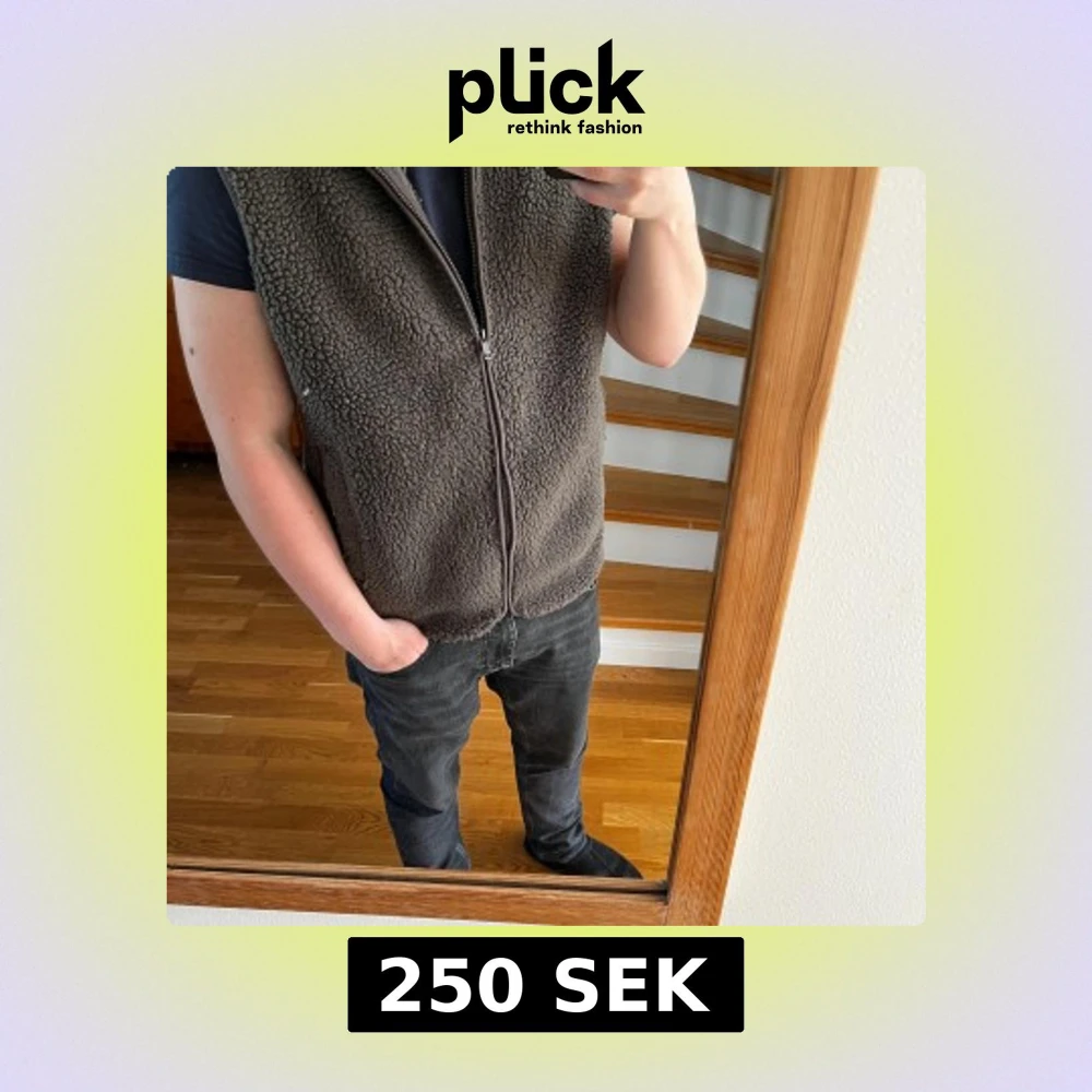 brun/grön fleeceväst med hel dragkedja framtill och två fickor.