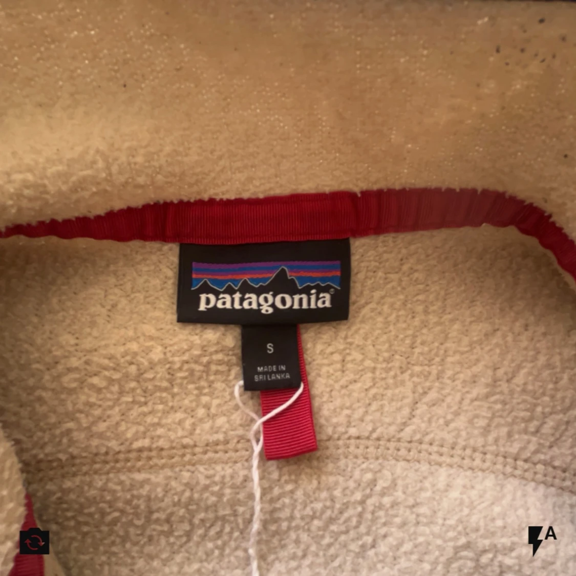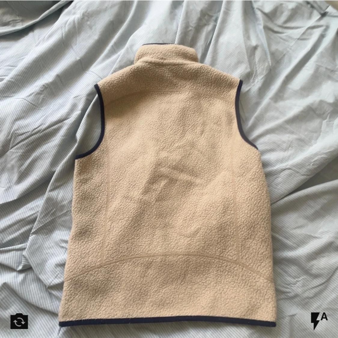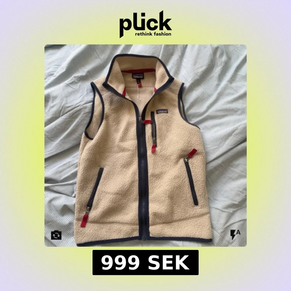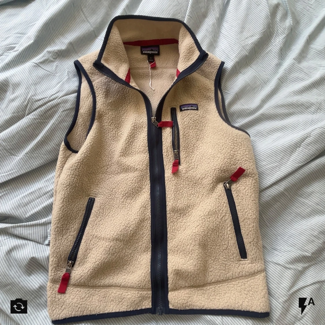 Säljer en beige fleeceväst från Patagonia i storlek S. Västen har marinblå detaljer, hel dragkedja framtill och tre fickor med röda zippar. Perfekt för lager-på-lager och har en hög krage för extra värme. Klassisk och stilren design.
