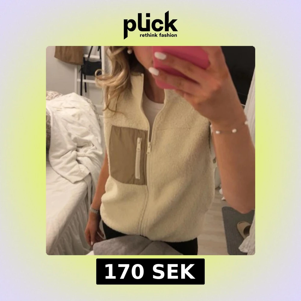 Mysig beige fleeceväst med hög krage och dragkedja framtill. Västen har en kontrasterande ljusbrun ficka med vit dragkedja på bröstet. Perfekt för lager-på-lager och enkel att matcha till olika outfits. I mycket bra skick!💗