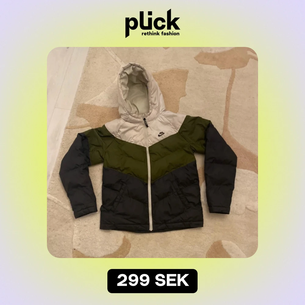 Säljer en snygg och varm polyester jacka från Nike i storlek XL KIDS, ungefär S i vanlig storlek. Jackan har en färgkombination av beige, grön och svart med en dragkedja framtill. Perfekt för kalla dagar med sin långa ärmar och huva.