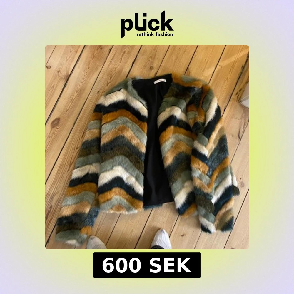 Säljer en snygg pälsjacka från Mango med zigzag-mönster i grönt, svart, vitt, beige och orange. Jackan har lång ärm och är fodrad med svart tyg på insidan.