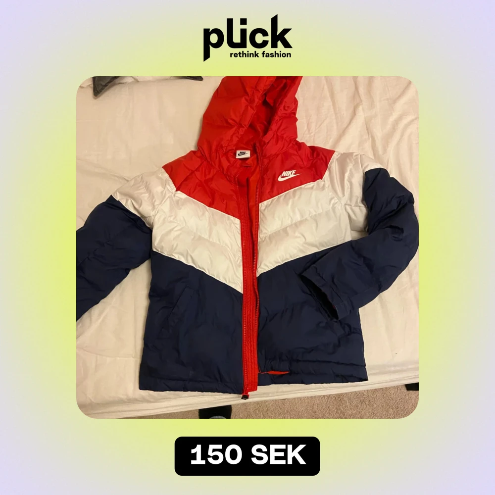 Säljer en snygg pufferjacka från Nike i rött, vitt och blått. Jackan har en dragkedja framtill och en huva för extra värme. Perfekt för kyliga dagar och har en sportig look. Passar bra till både vardag och fritid. 🧥