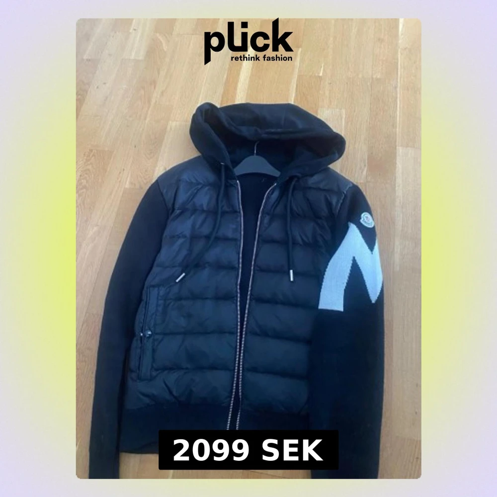 Säljer en svart pufferjacka från Moncler med huva och dragkedja. Jackan har stickade ärmar med en stor vit M-detalj på ena ärmen och Moncler-logga. Framsidan är quiltad och har fickor med knappstängning. Perfekt för dig som vill ha en snygg och sportig look. Väldigt sällsynt jacka dessvärre priset