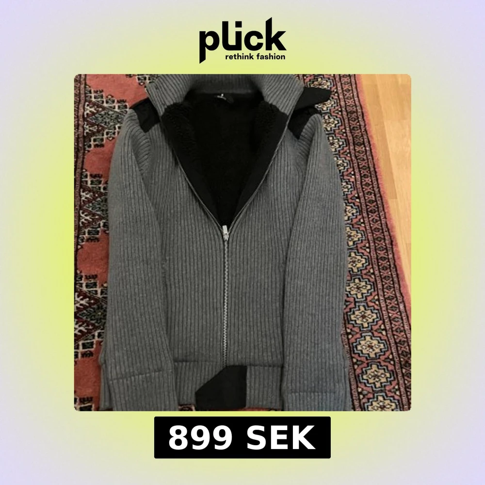 Säljer en stilren grå fodrad cardigan med dragkedja och svarta axeldetaljer. Jackan har en hög krage och långa ärmar, perfekt för kyligare dagar. Den ribbade designen ger en modern look.