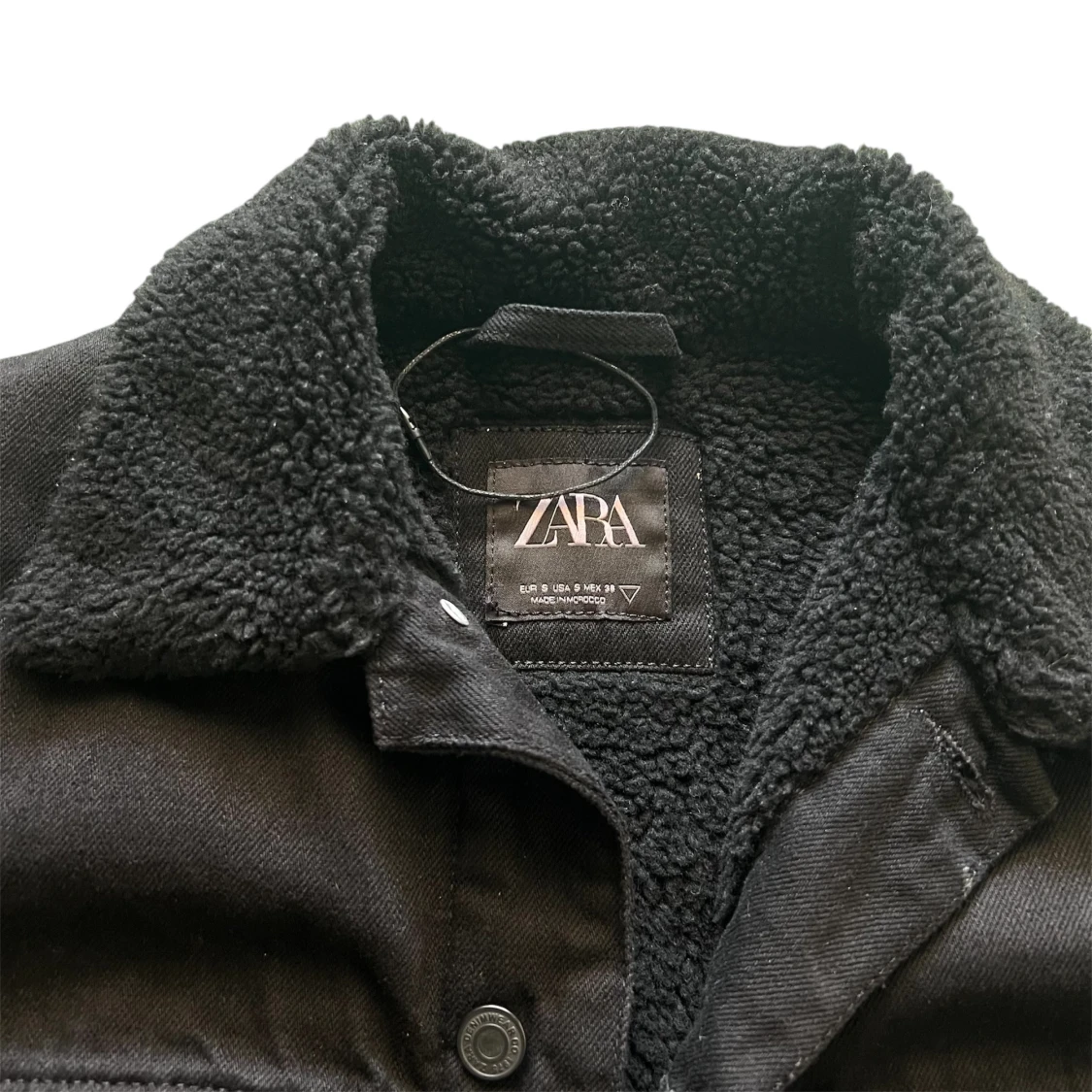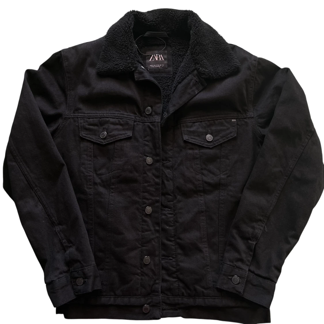 Svart jeansjacka från Zara med mjuk teddykrage och foder. Klassisk modell med knappar framtill och två bröstfickor med lock. Perfekt för dig som vill ha en stilren jacka med extra värme och cool vibe. Använd endast en gång. storlek S