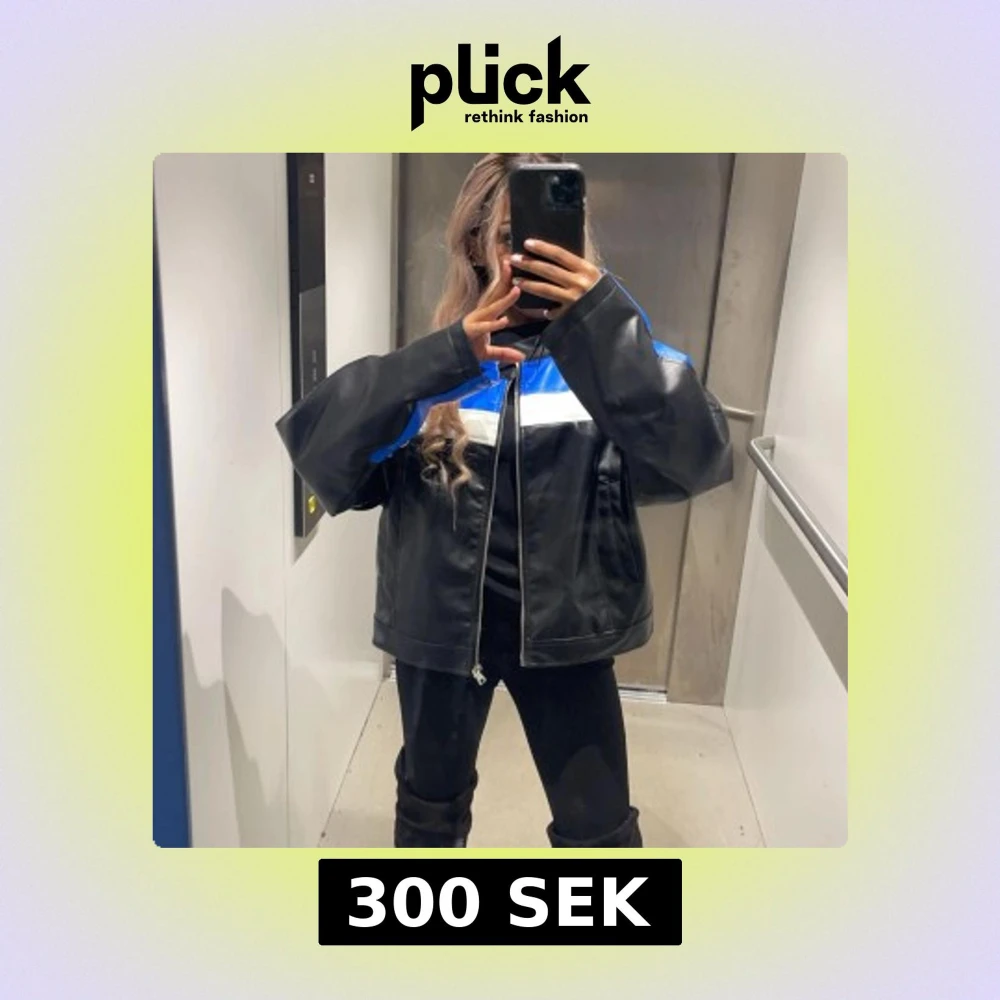 Snygg svart skinnjacka med blå och vita detaljer. Jackan har en dragkedja framtill och en cool, oversized passform. Perfekt för en stilren look.