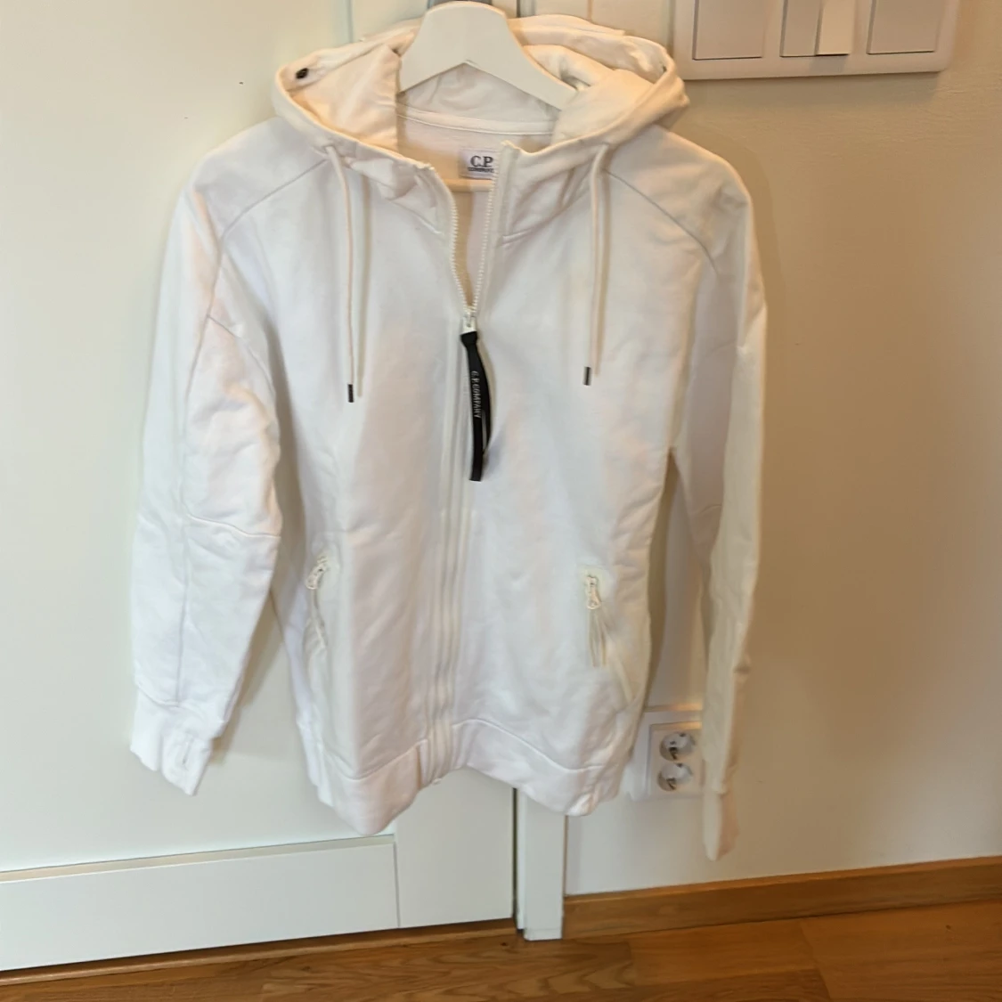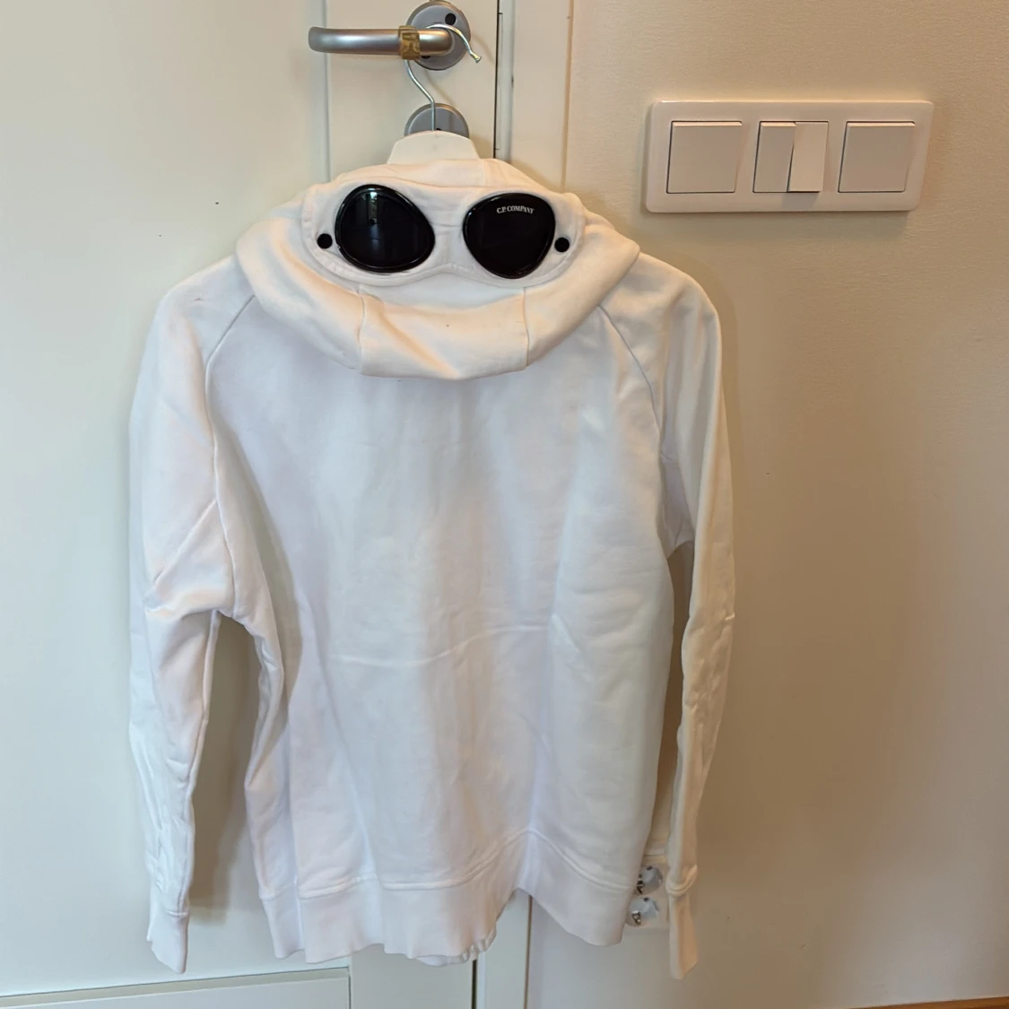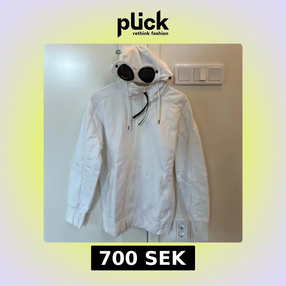 Vit hoodiejacka från CP Company med ikoniska goggles i huvan. Jackan har dragkedja framtill, två fickor med dragkedja och ribbade muddar med tumhål. Snygg och clean design, perfekt för dig som gillar streetwear och vill sticka ut.