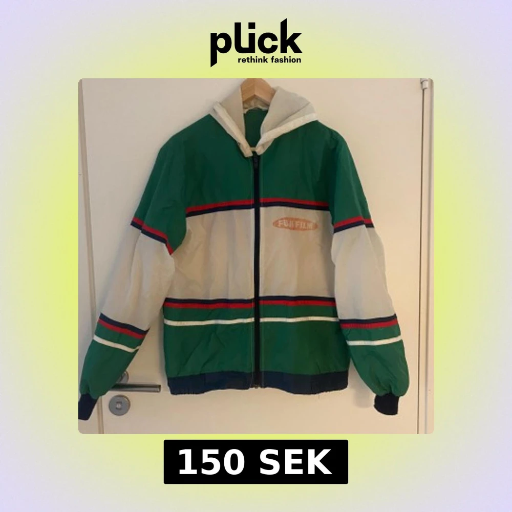 Jättecool vindjacka från Fuji Film! Vintage men knappt använd av mig. Fint skick förutom några fläckar och lös tråd enligt bild, men inget som märks egentligen.