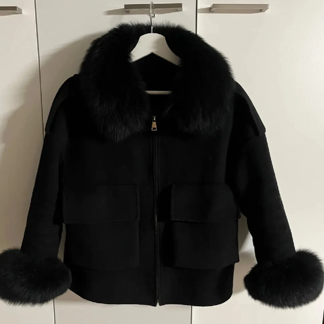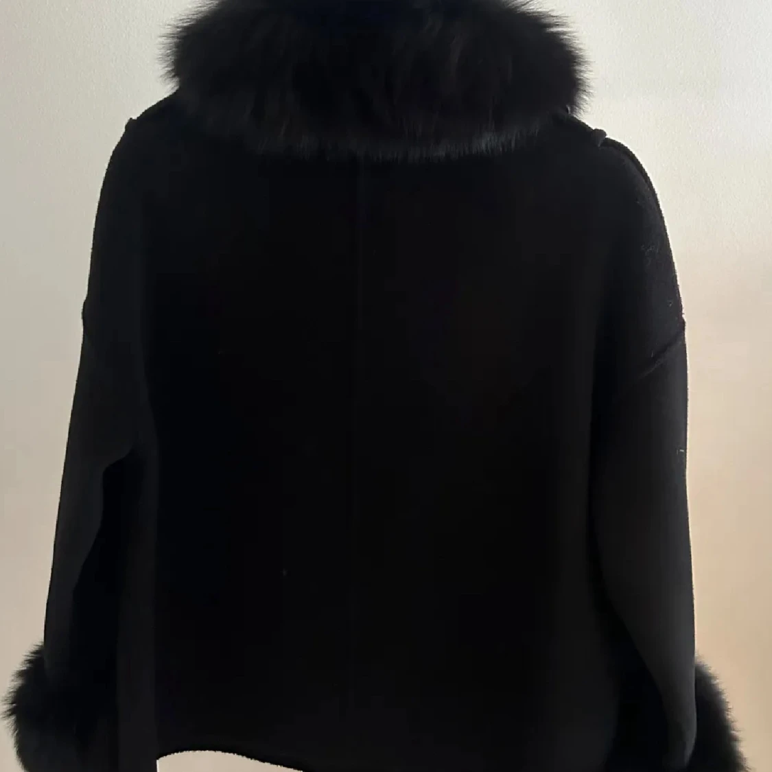 Jackan är av ull och Kashmir alltså riktigt bra kvalite. Snygg svart kappa med fluffig päls runt krage och ärmslut. Jackan har två stora fickor framtill, dragkedja och en rak passform. Perfekt för dig som vill sticka ut med en lyxig vibe i vinter.