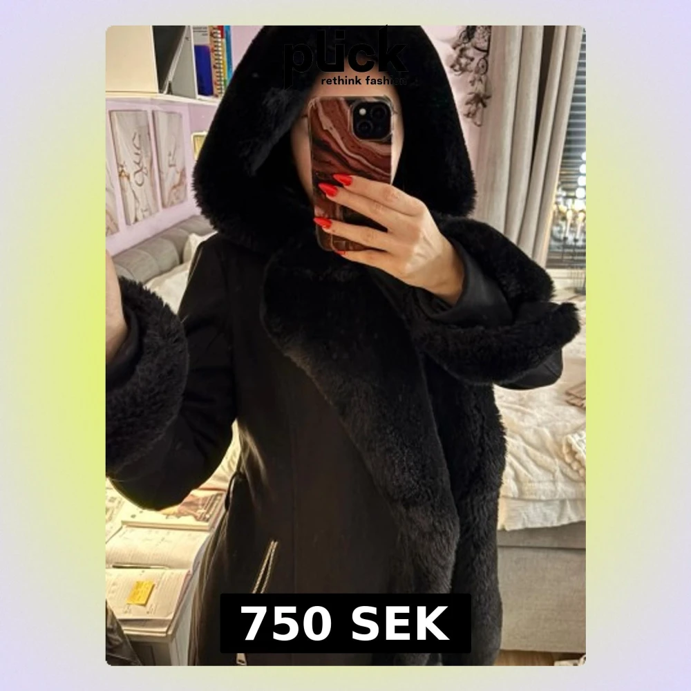 Säljer en svart pälsjacka med stor fluffig huva och breda pälsdetaljer längs krage och ärmslut. Jackan har dragkedja i sidan och är riktigt mysig och varm. Dock saknas bältet.