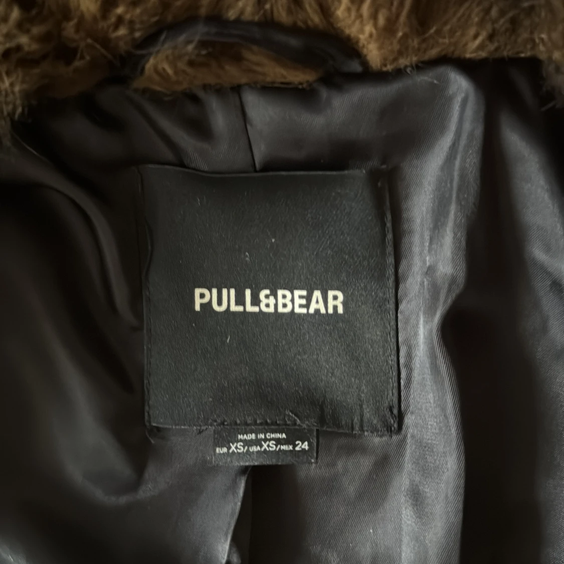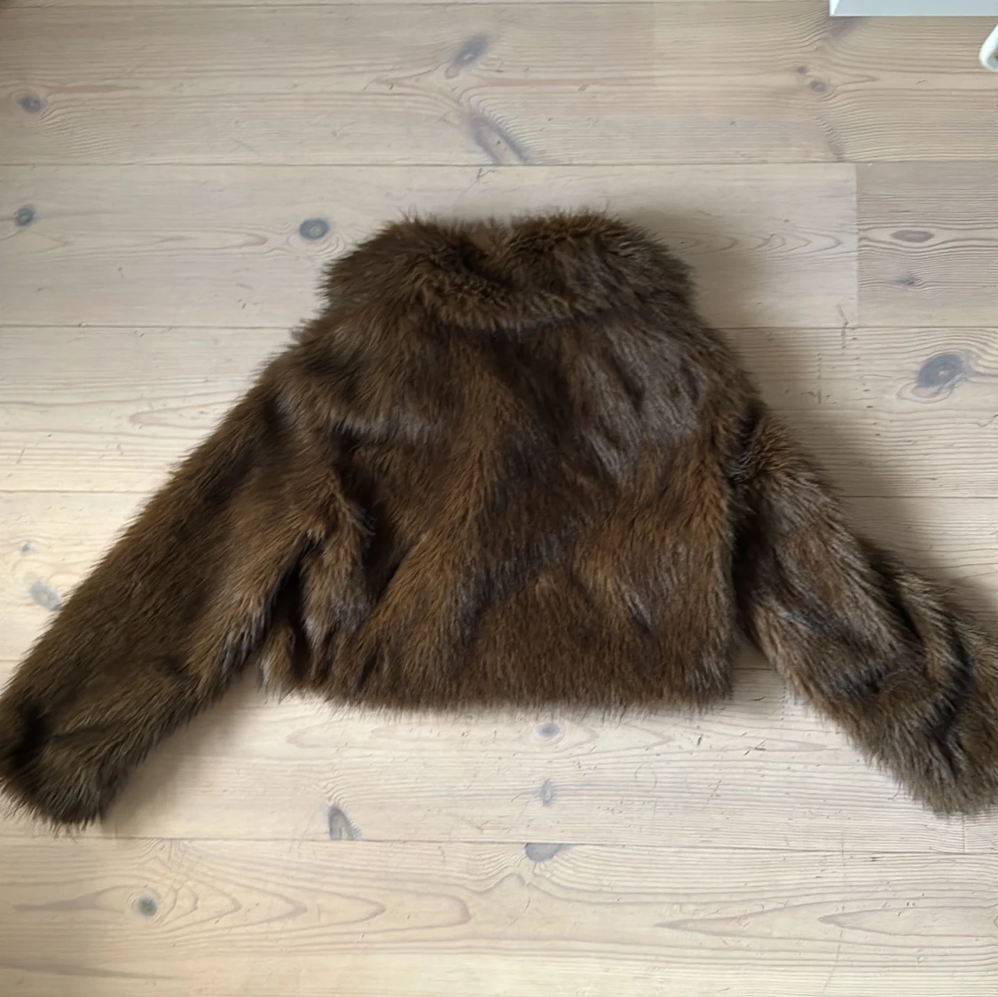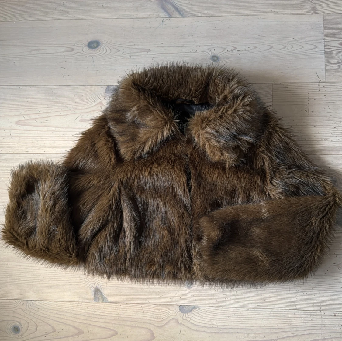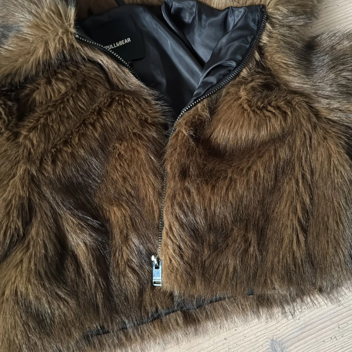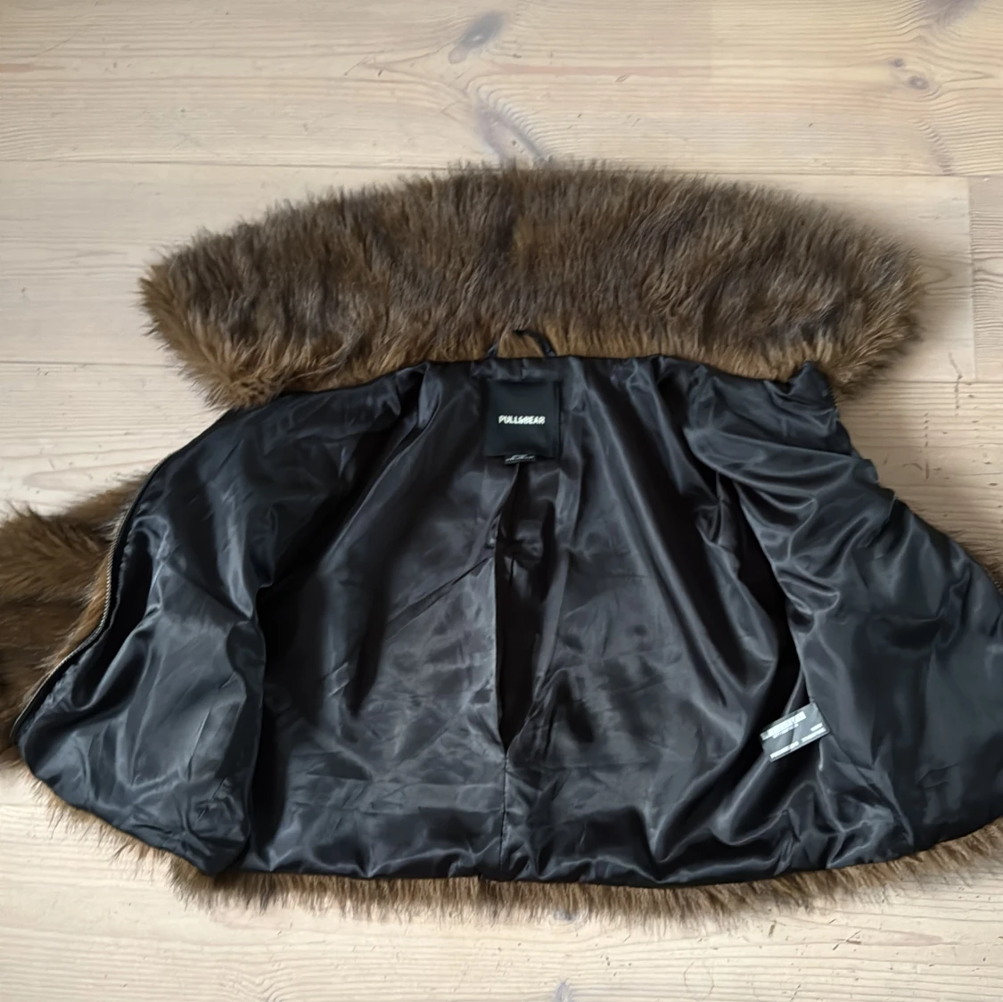 Snygg brun pälsjacka från Pull&Bear i storlek XS. Jackan har fluffig fuskpäls, bred krage och helsvart innerfoder. Perfekt för dig som vill sticka ut med en trendig och varm look under kyliga dagar. Modellen är midjekort.