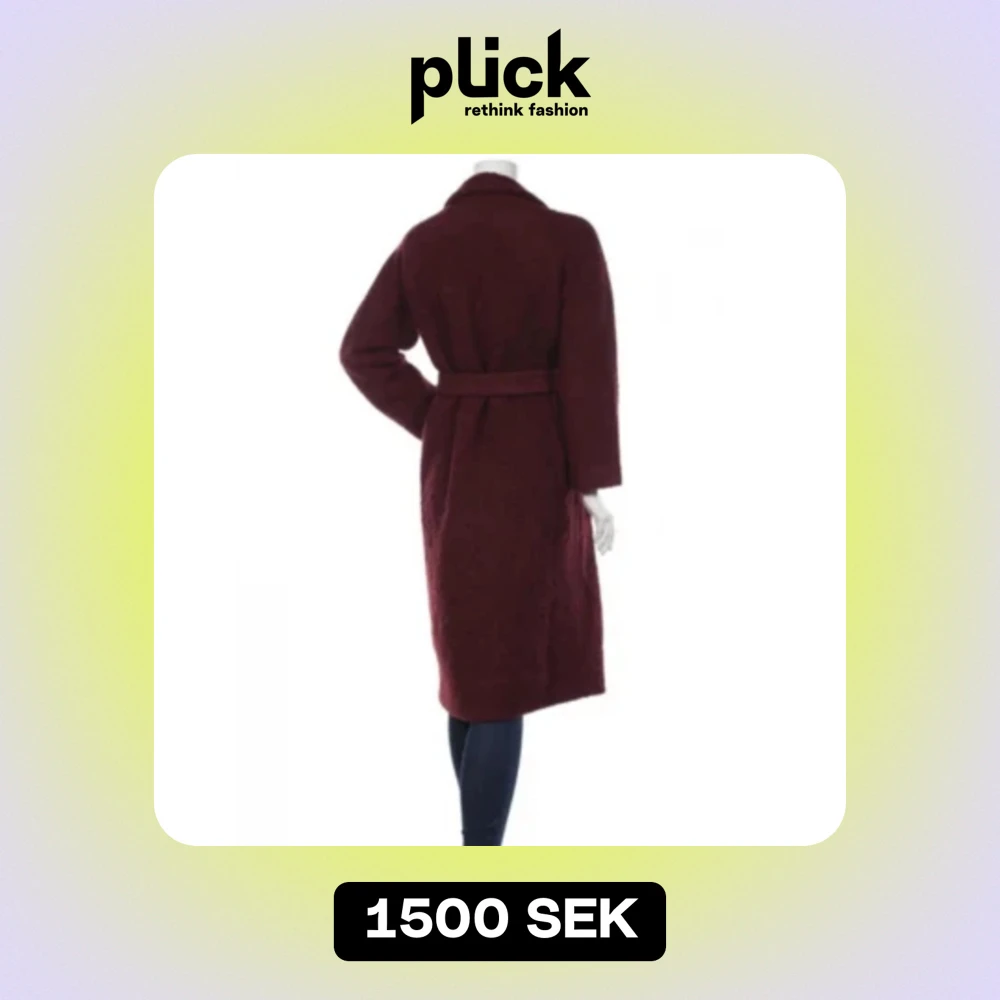 En lång ullkappa i bra skick, vinröd. Den har en krage, en knäppning framtill och en bälte i midjan. Den har två fickor på framsidan. Jag är 162 cm och kappan slutar precis ovanför knäna. Nypris ca 3500:-