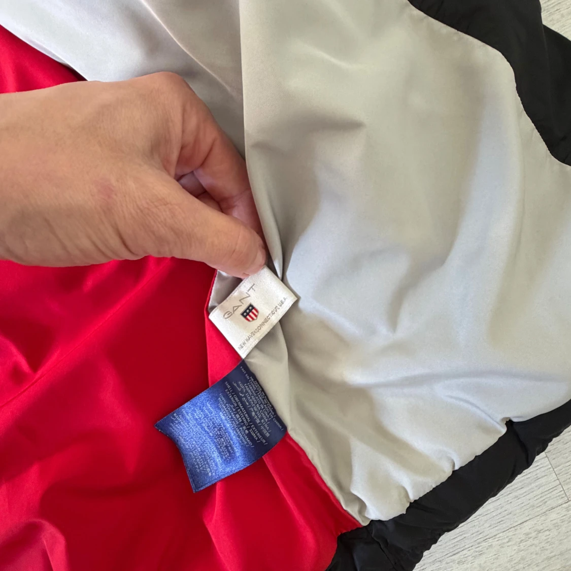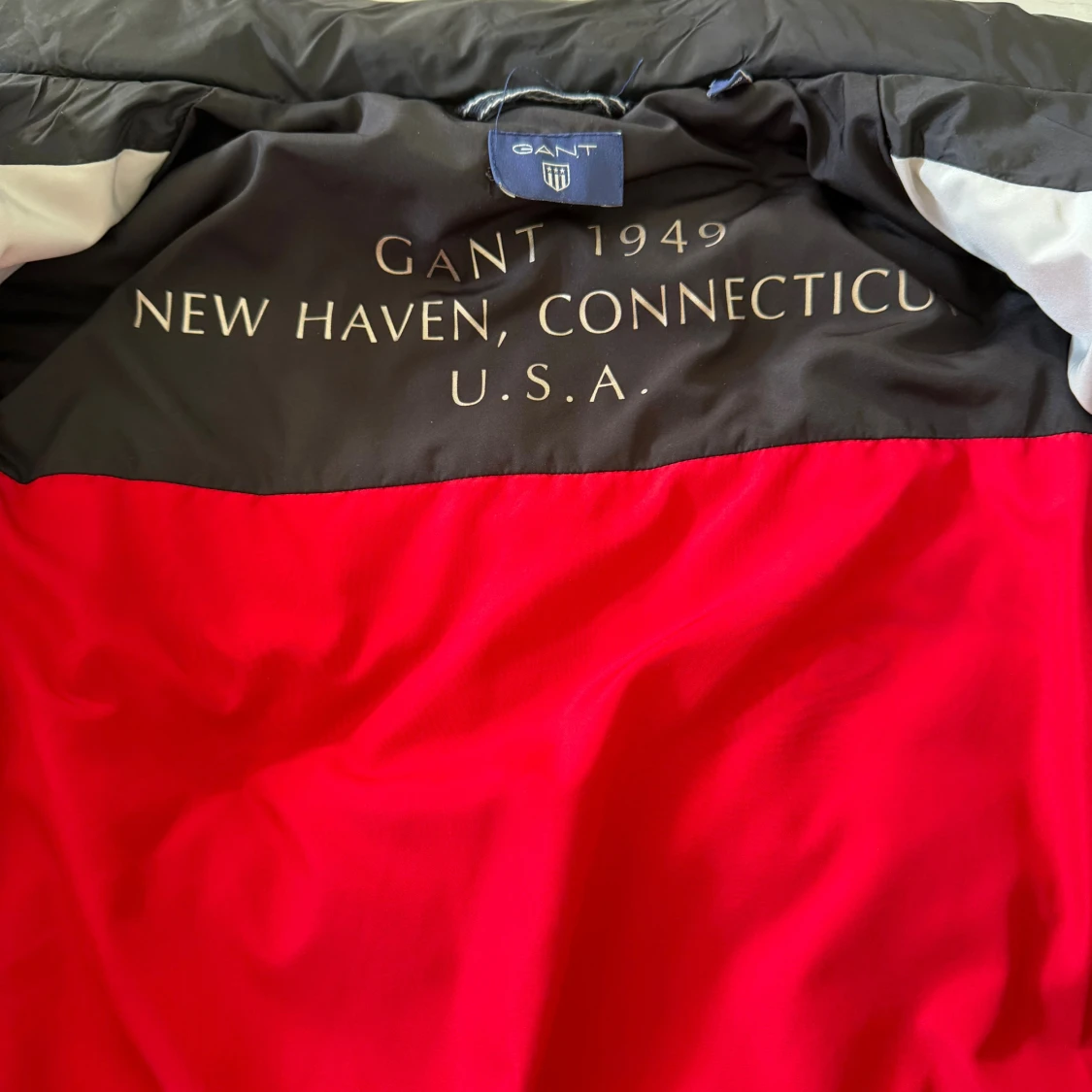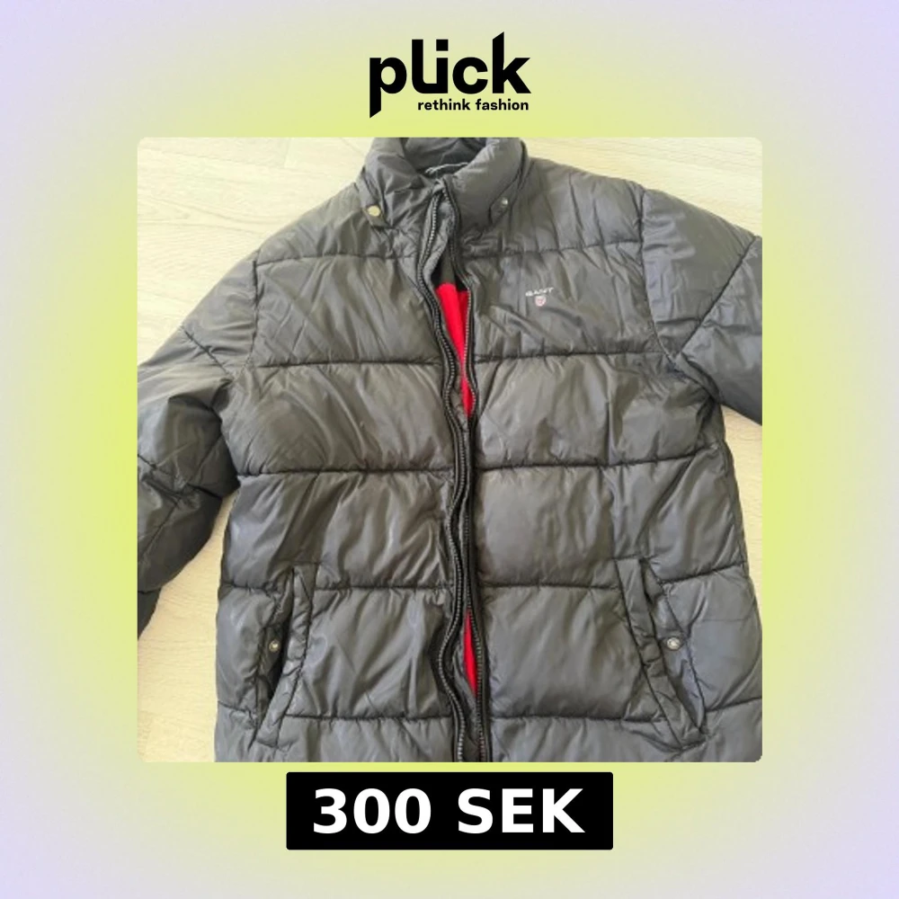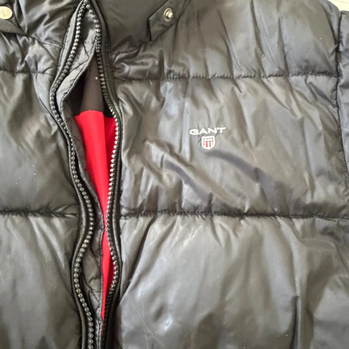 Snygg svart barn pufferjacka från Gant med broderad logga på bröstet. Jackan har quiltad design, dragkedja framtill och två fickor med tryckknapp. Insidan är fodrad i rött, svart och grått med tryckt text. Perfekt för kalla dagar. Luva saknas. Lite sliten men i bra skick. Storlek ungefär 14 år.