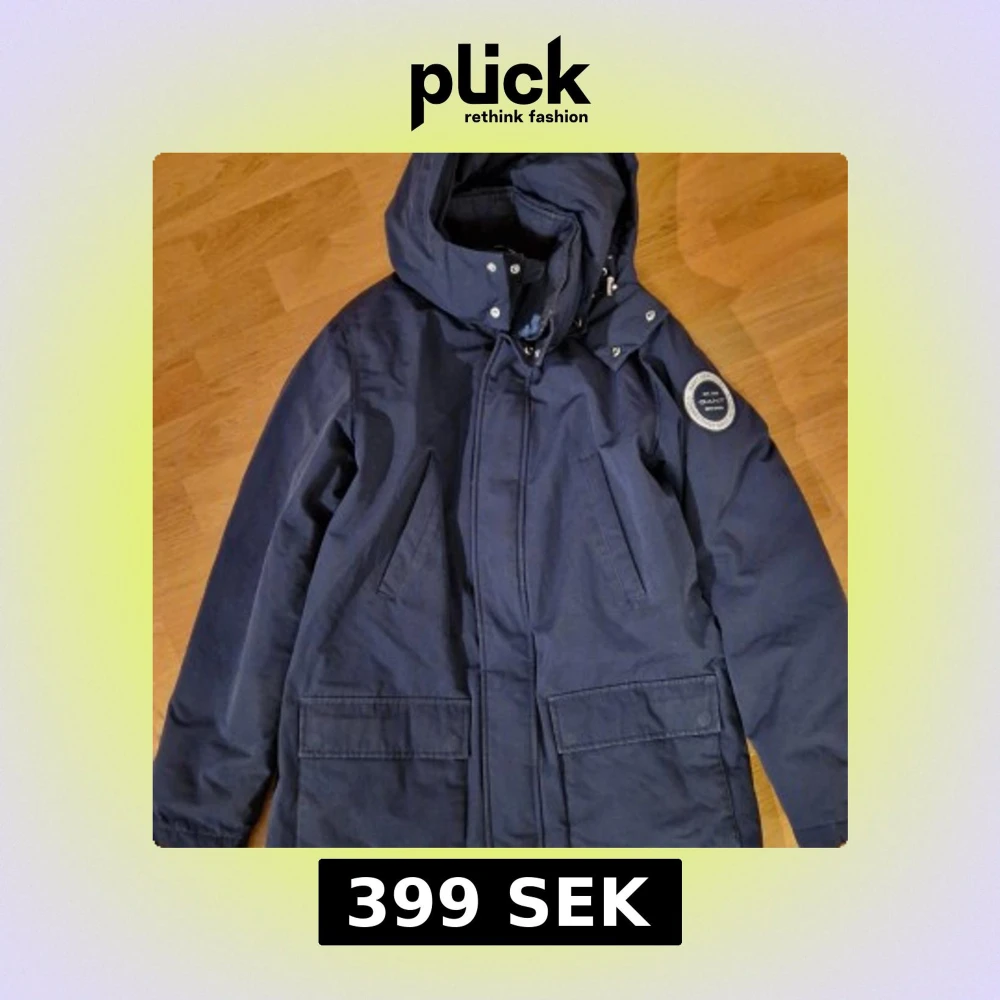 Snygg fodrad GANT mörkblå parkajacka med huva och praktiska fickor. Jackan har en stilren design med knappar och dragkedja framtill. Perfekt för kyligare dagar. 100% äkta eftersom den köpts i GANT butik. Name tag på fodret har överstruket namn. Djur- och rökfritt hem.