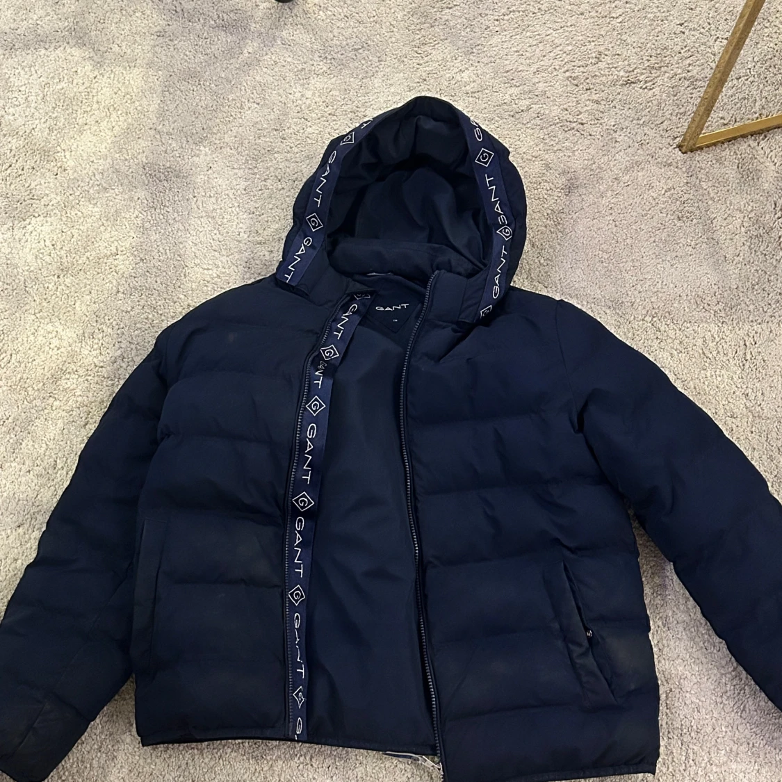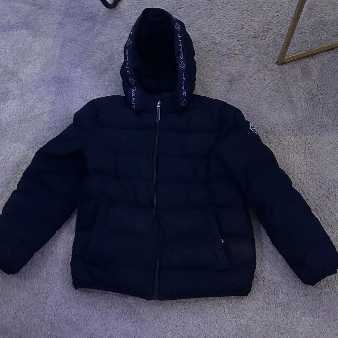 Säljer en snygg svart pufferjacka från GANT med huva och dragkedja. Jackan har märkets logga på ärmen och längs dragkedjan. Perfekt för kyligare dagar.