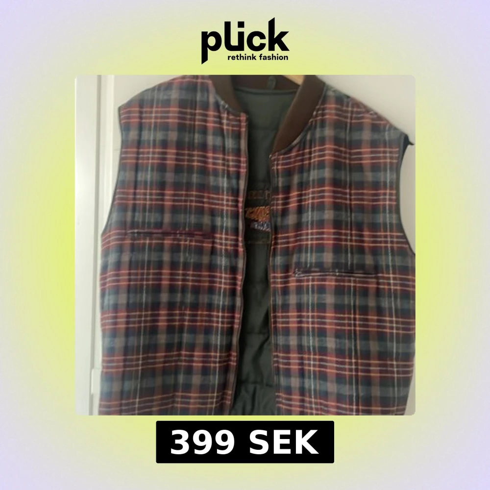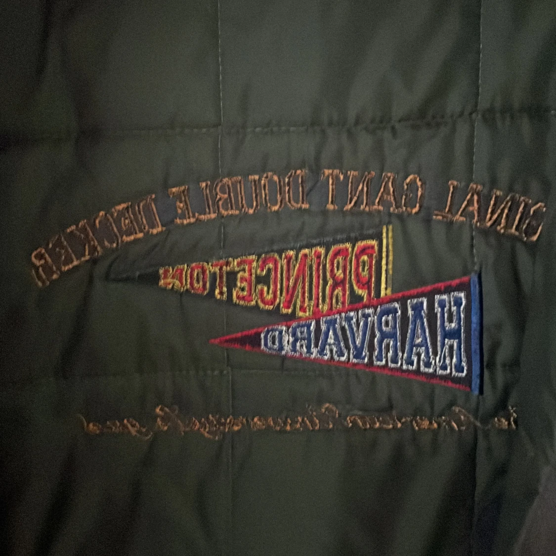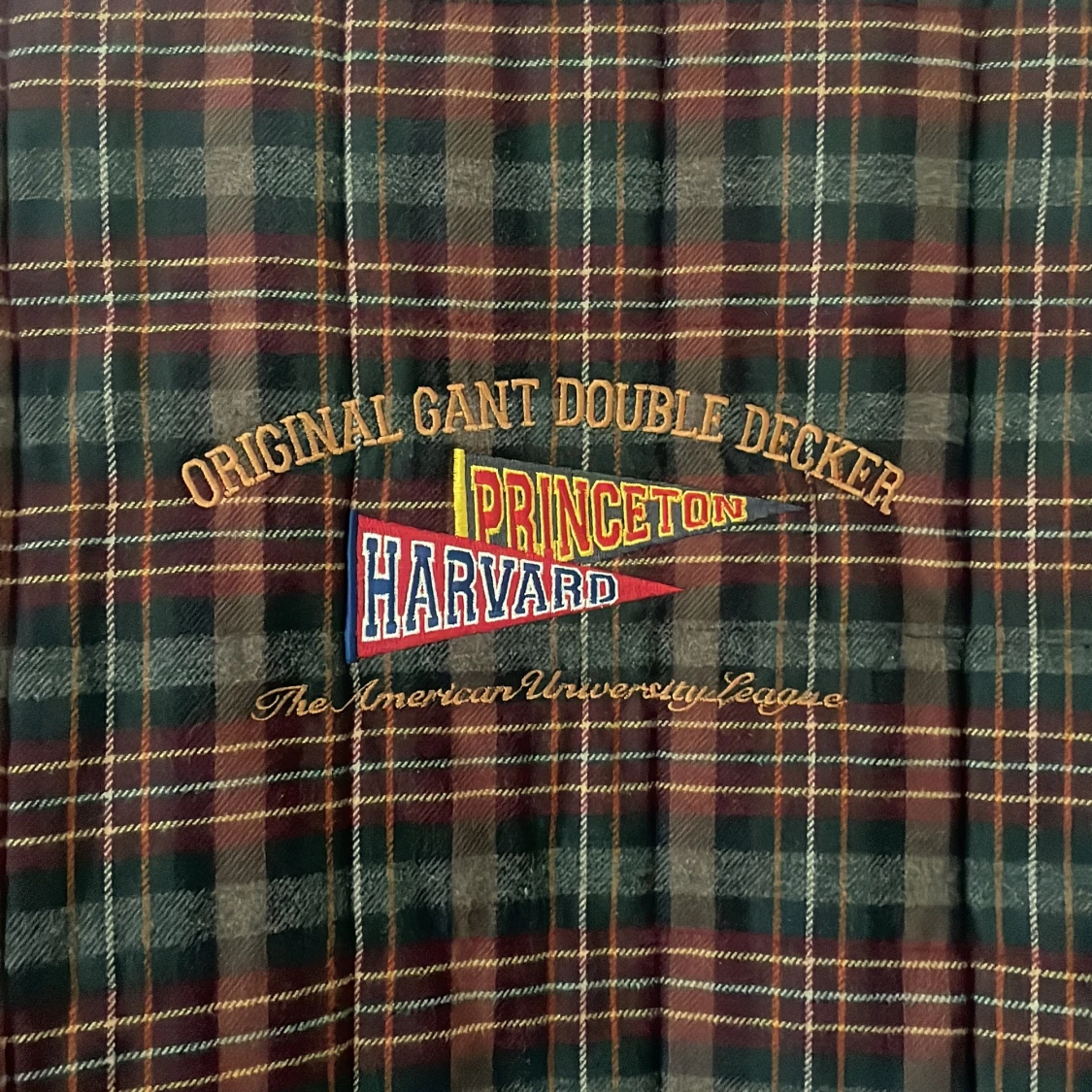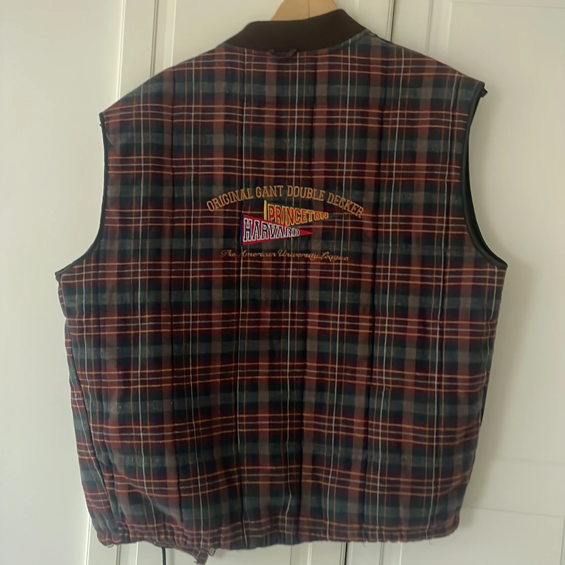 Säljer en rutig dunväst från Gant med broderad text och flaggor på ryggen. Västen har mörkblå, gröna och röda toner med inslag av gult och brunt. Den är quiltad och har två fickor framtill samt en brun krage. Perfekt för dig som gillar preppy college-stil.