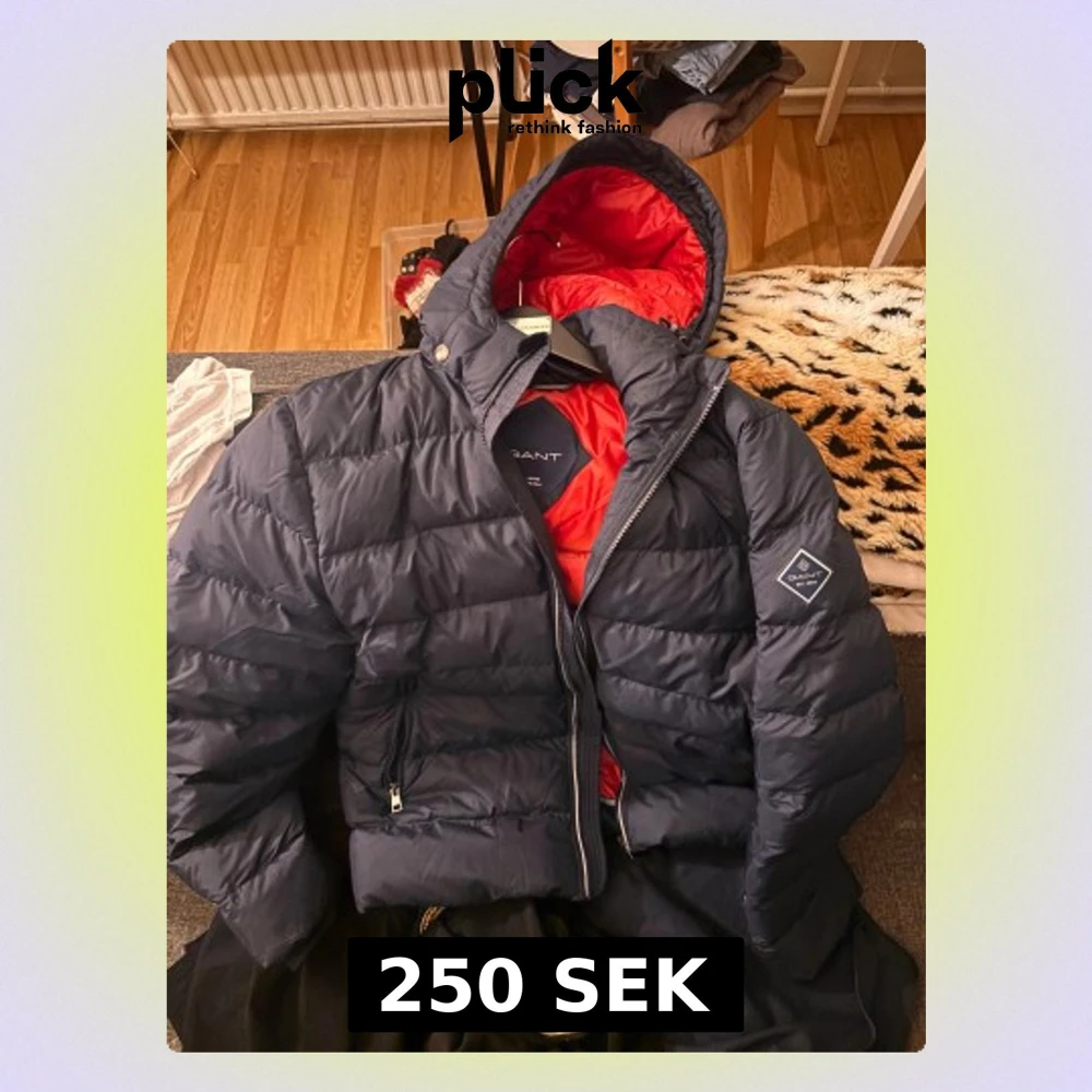 Säljer en mörkblå pufferjacka från GANT med röd insida och huva. Jackan har dragkedja. Använd några fåtal gånger
