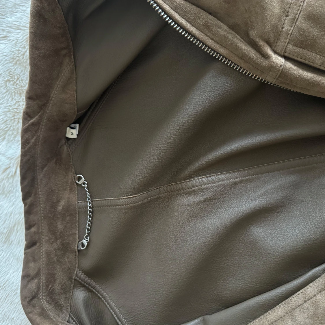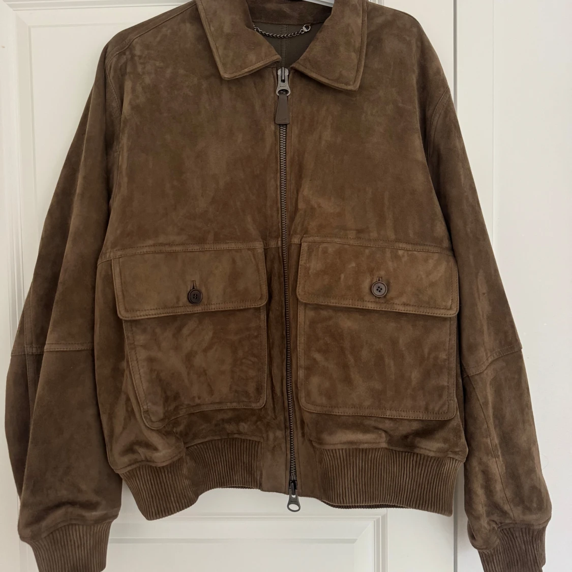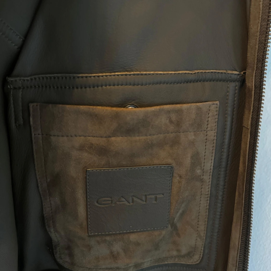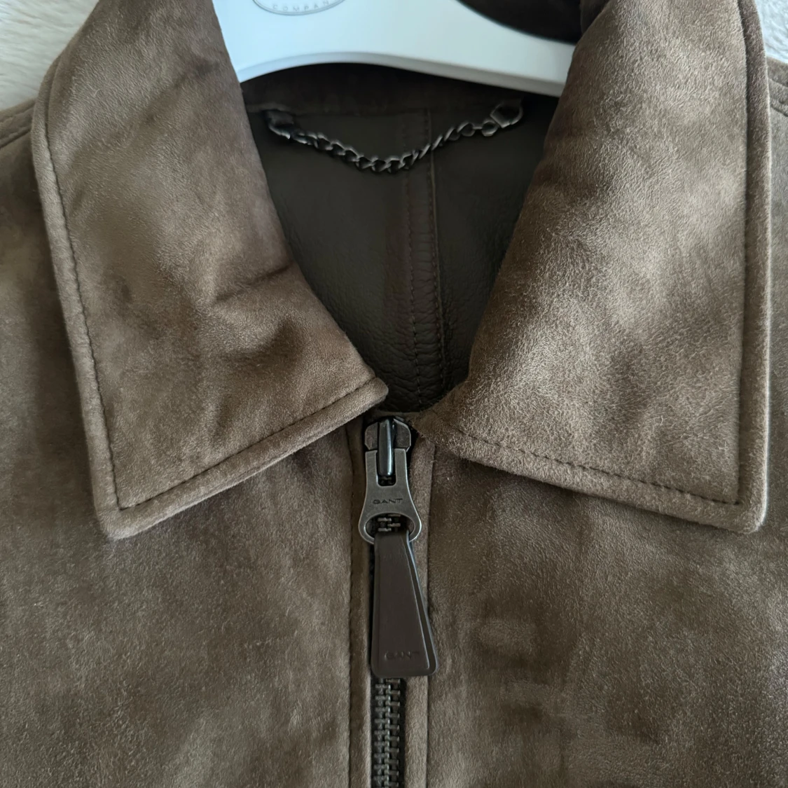 Säljer en brun mockajacka från Gant med klassisk krage, två stora fickor framtill med knappar och grov dragkedja. Jackan har ribbade muddar och en schysst loose passform. Insidan är fodrad med slätt skinn för extra premiumkänsla. Perfekt för dig som gillar stilren och tidlös look. Den är helt oanvänd och funkar som unisex såklart! Ordinarie pris 12 000kr