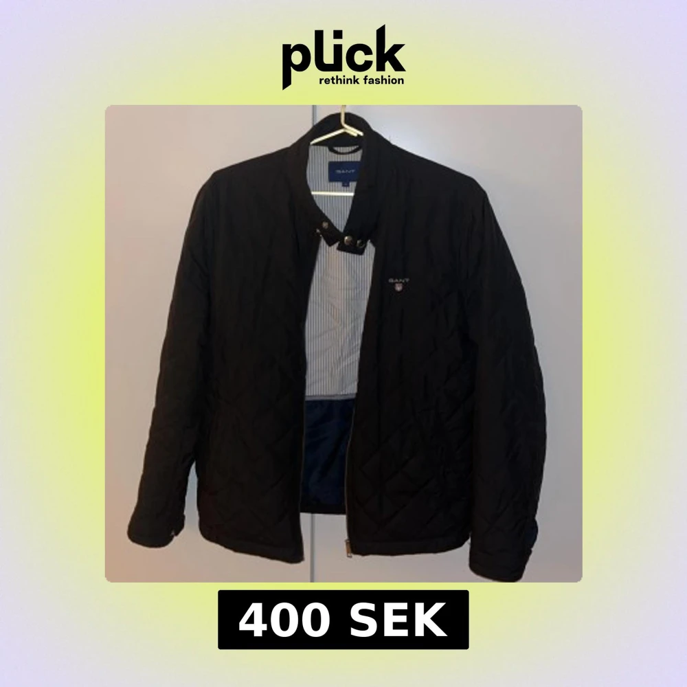 Quiltad svart jacka från GANT med ståkrage och dragkedja framtill. Jackan har ett diskret GANT-emblem på bröstet och snyggt rutmönster. Insidan är randig i blått och vitt, vilket ger en fräsch kontrast. Perfekt för dig som gillar stilren och klassisk look.
