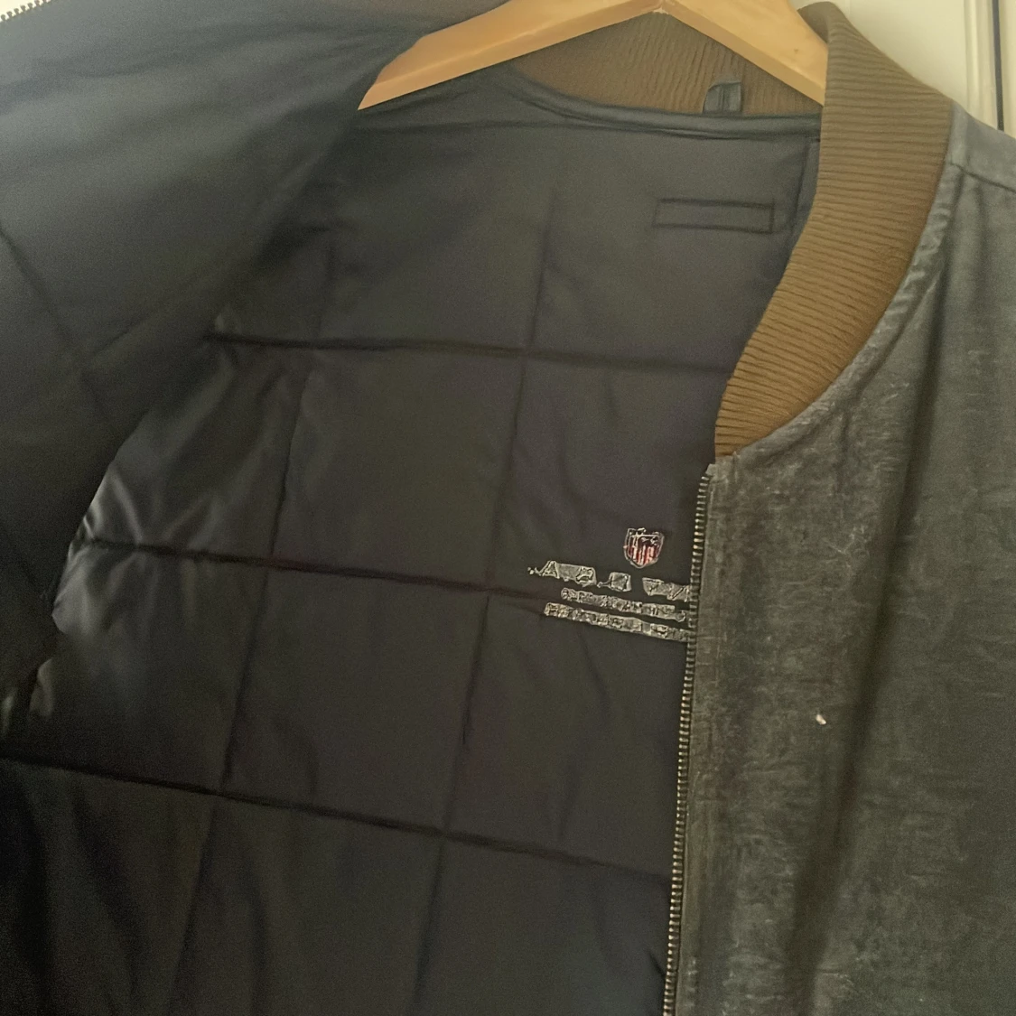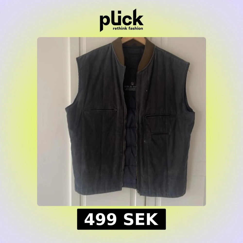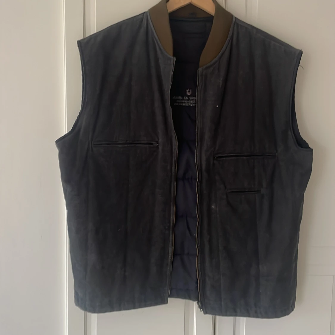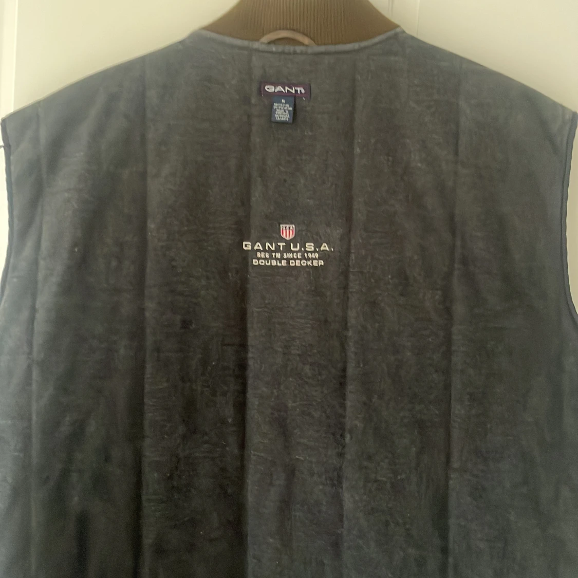 Säljer en mörkgrå mockaväst från Gant med quiltad insida och ribbad krage i brunt. Västen har dragkedja framtill och två diskreta fickor med dragkedja. Broderad Gant-logga på ryggen. Perfekt för lager-på-lager-stil.
