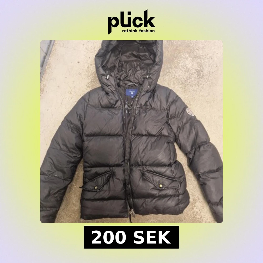 Säljer en svart pufferjacka från Gant i storlek XS. Jackan har huva med snörning, dragkedja framtill och två stora fickor med lock och knapp. Insidan har en innerficka med dragkedja och snygga detaljer längs fodret.