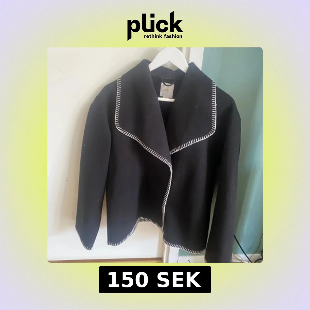 Säljer en svart kappa från Gina Tricot med dekorativa vita sömmar längs kanterna. Jackan har stora slag, knäppning framtill och lång ärm. Perfekt för dig som vill ha en stilren och trendig look.