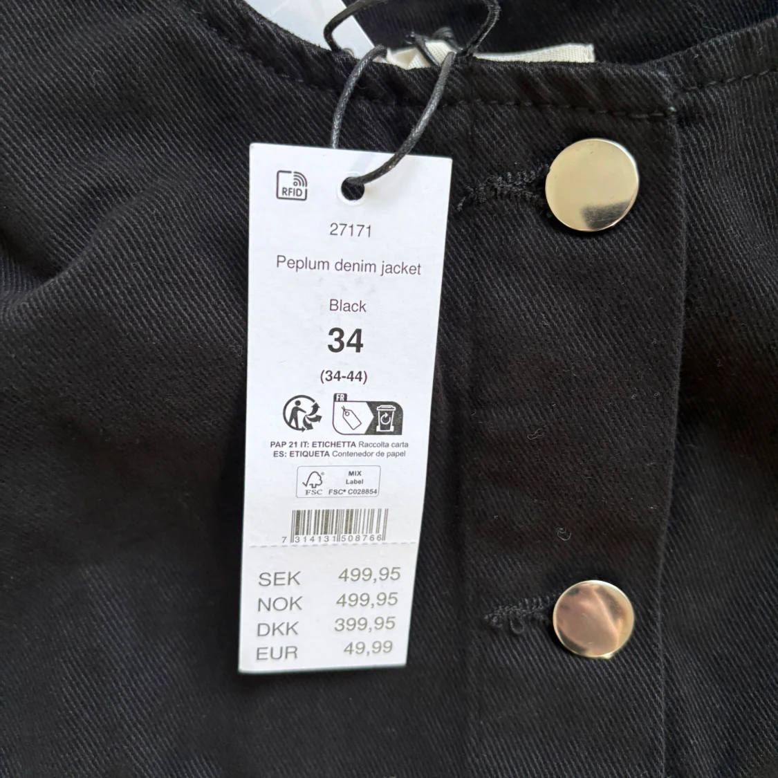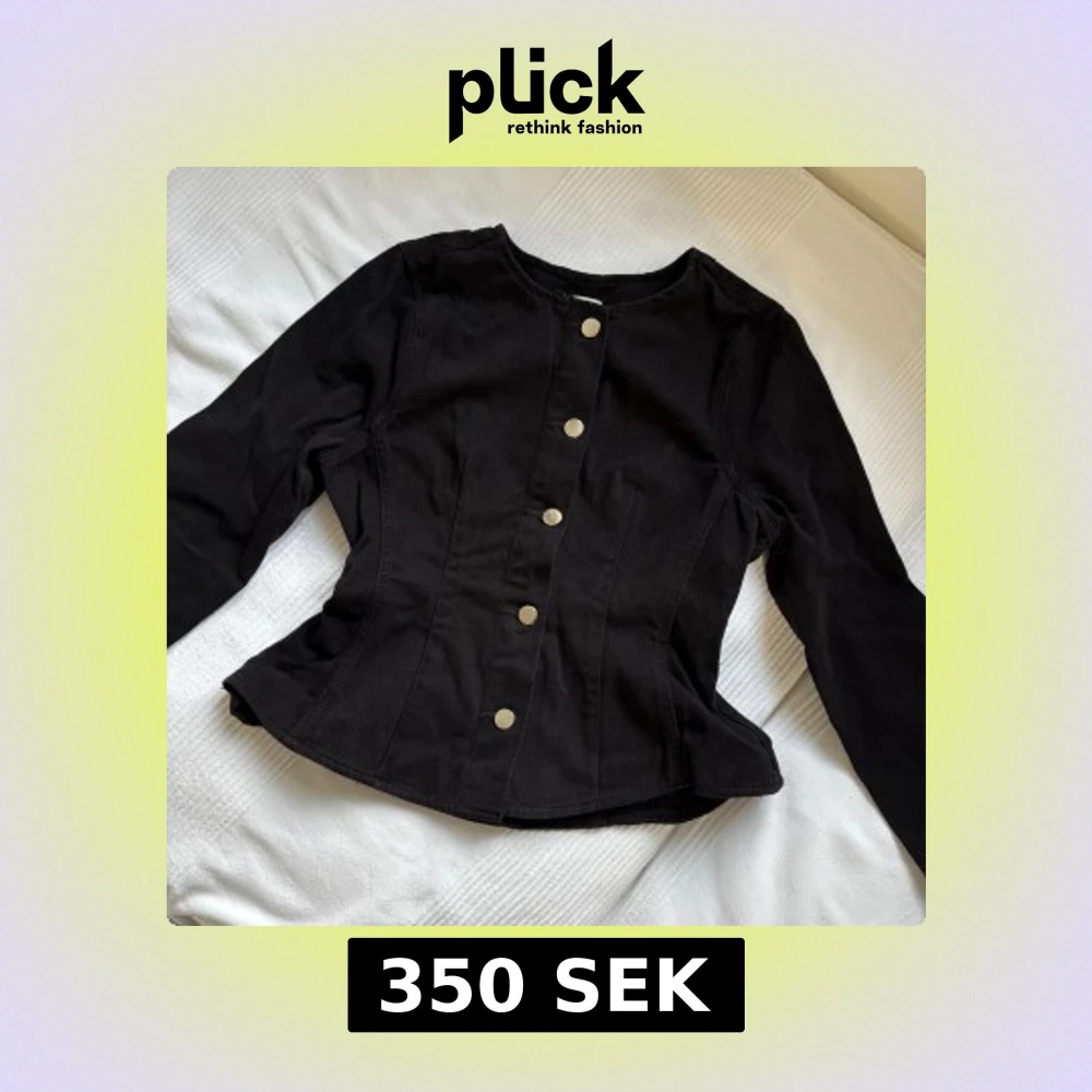 Snygg svart peplum jeansjacka från ginatricot med markerad midja och silverfärgade knappar framtill. Jackan har lång ärm och är tillverkad i denim med en figurnära passform. Perfekt för dig som gillar en stilren och trendig look. Helt ny med prislappen, säljer pga förliten