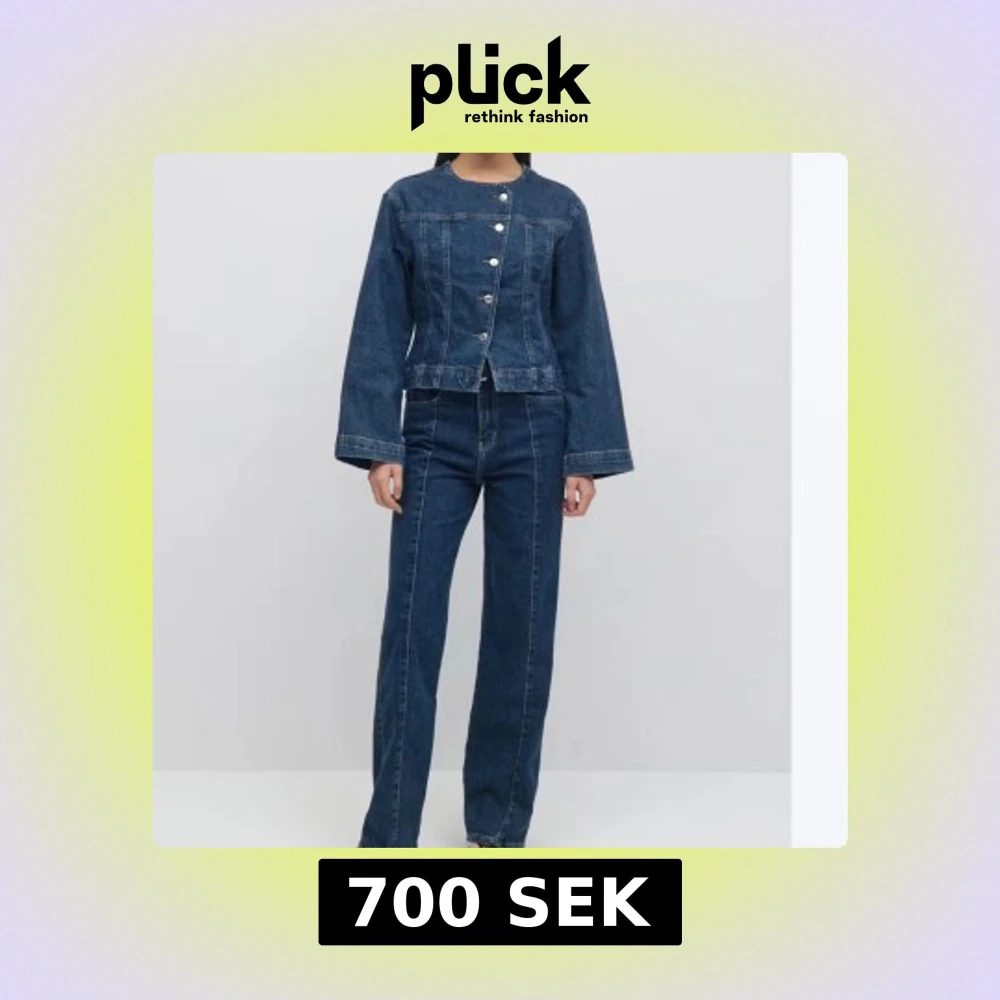 Snygg mörkblå jeansjacka med silverfärgade knappar framtill. Matchande jeans till. Jackan är i storlek 38 och jeansen är i storlek 40. Enbart använt en gång och är i gott skick.