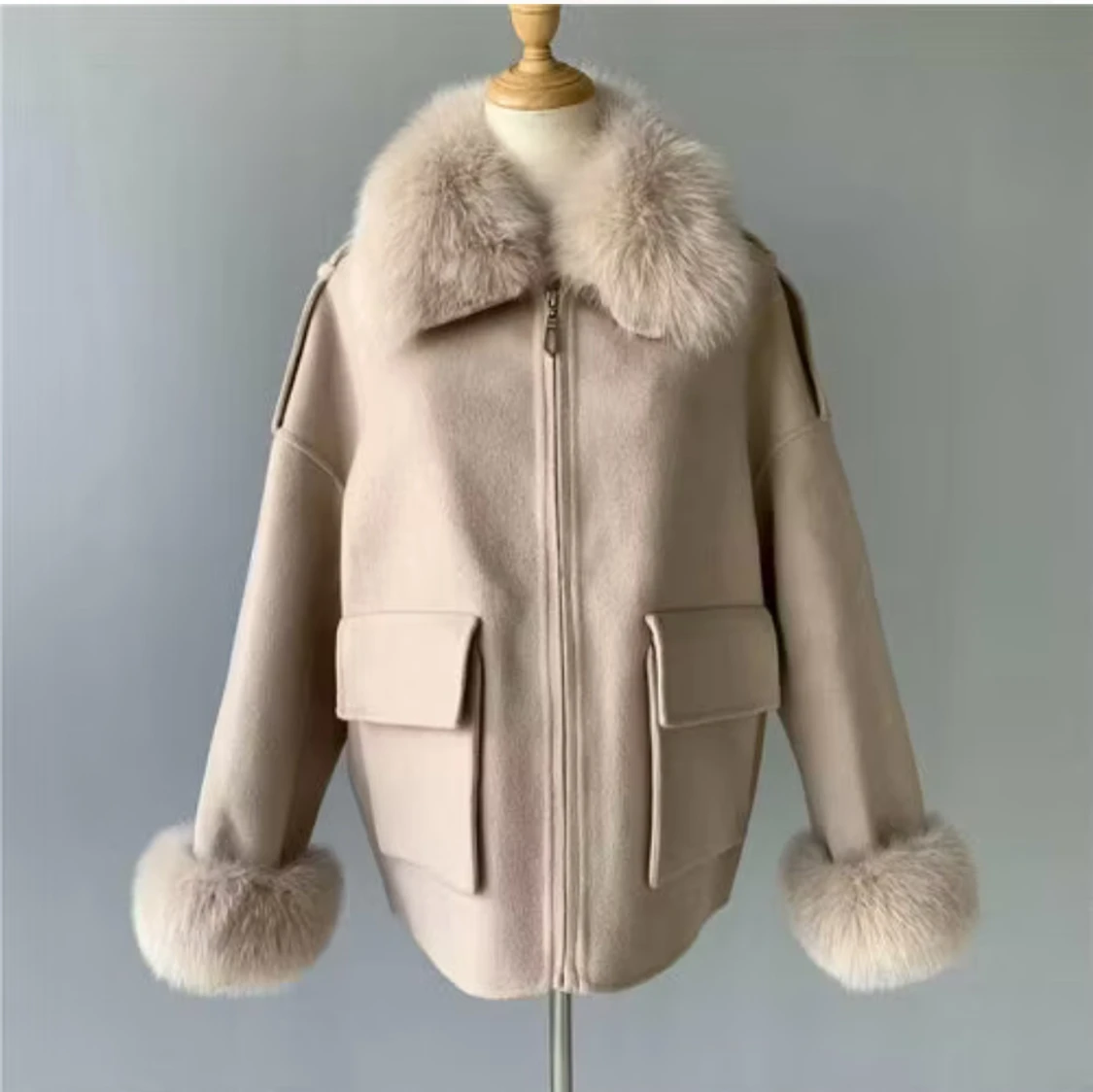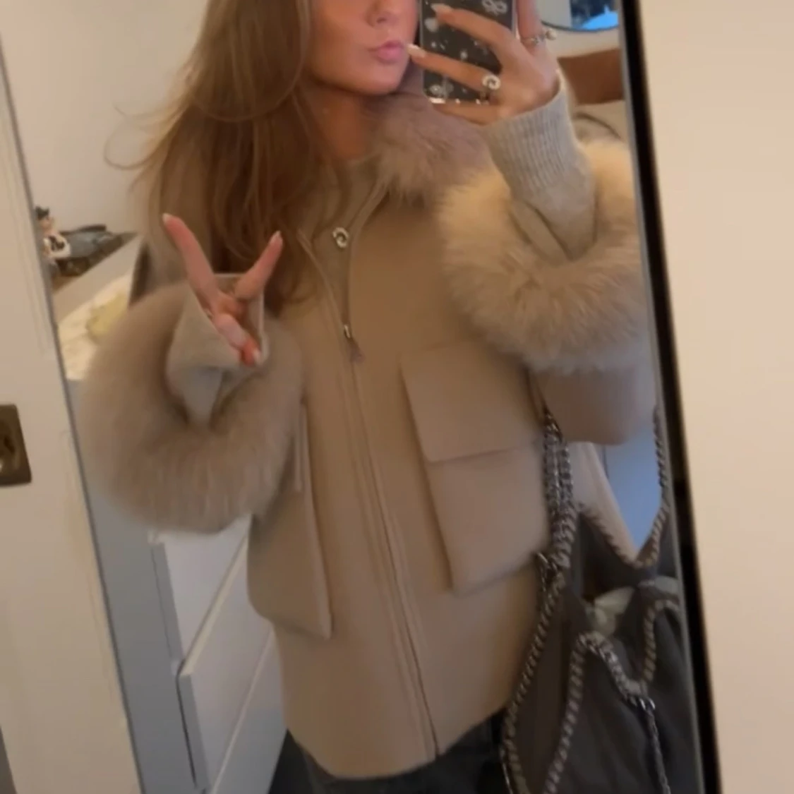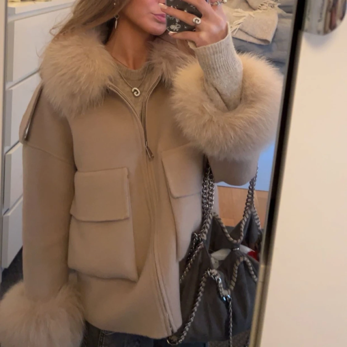 Säljer en skitsnygg beige kappa med fluffig krage och muddar i päls från fur Stockholm. Jackan har dragkedja framtill, två stora fickor och en loose passform. Perfekt för dig som vill ha en mysig och trendig look under kyliga dagar! Den kan förvandla en lite halvtråkig outfit till en snygg på en sekund😍Just för att den är oversized så passar den alltifrån xs-m beroende på önskad passform! Nypris: 2300kr