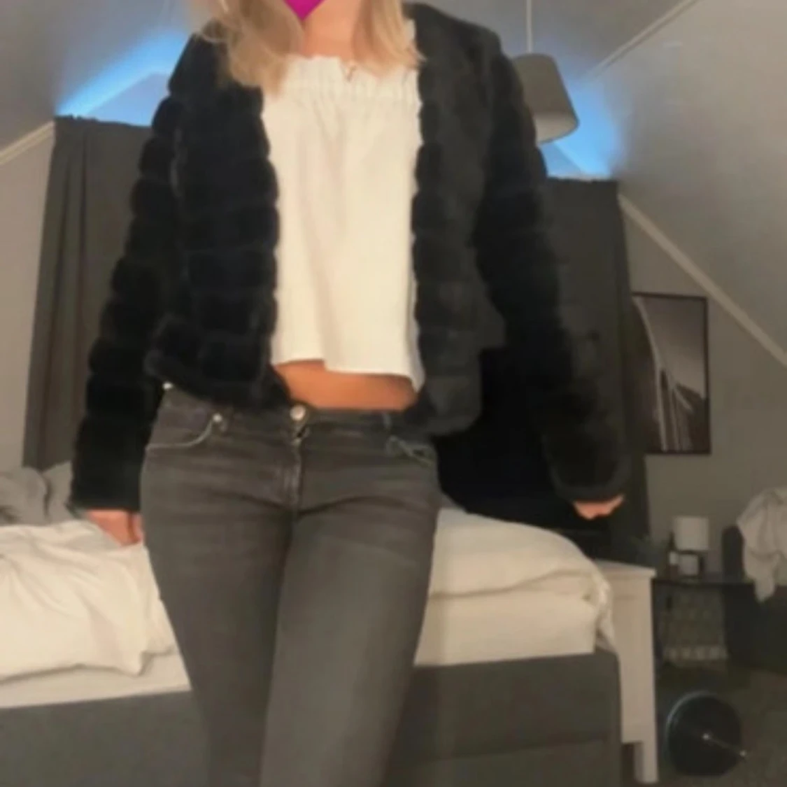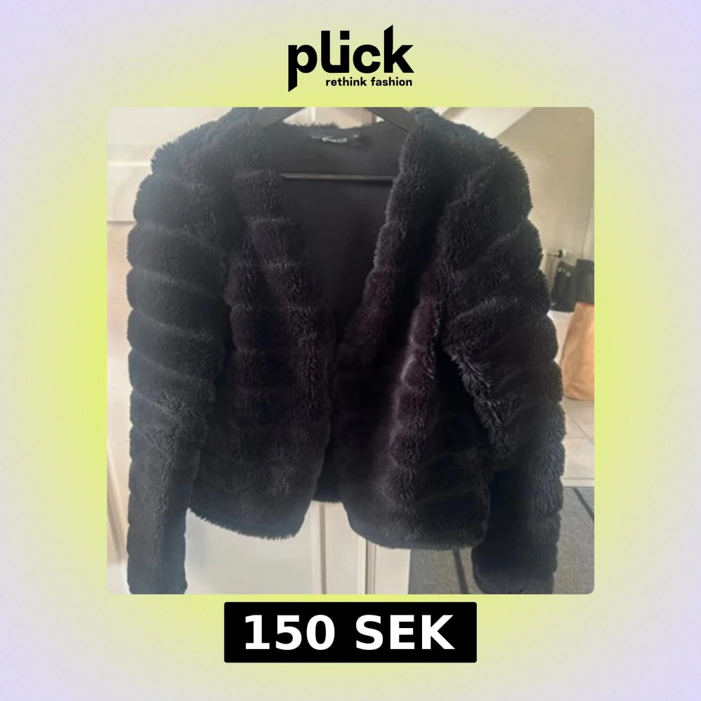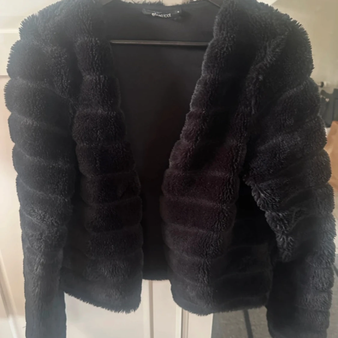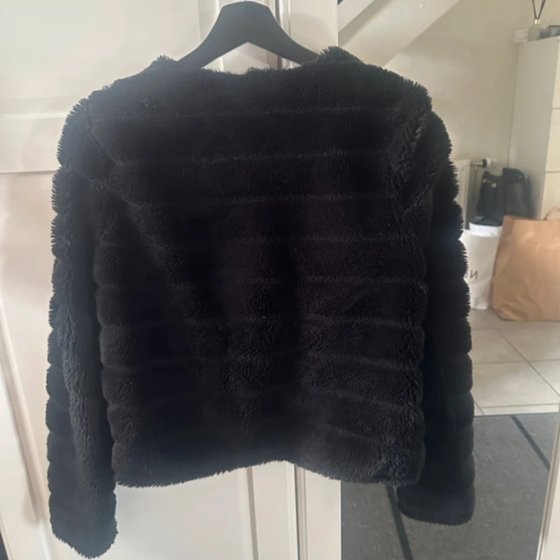 Mysig svart pälsjacka från GinaTricot med horisontella ränder och öppen framtill. Jackan är kortare i modellen och har långa ärmar. Strl M, men mer som xs-s