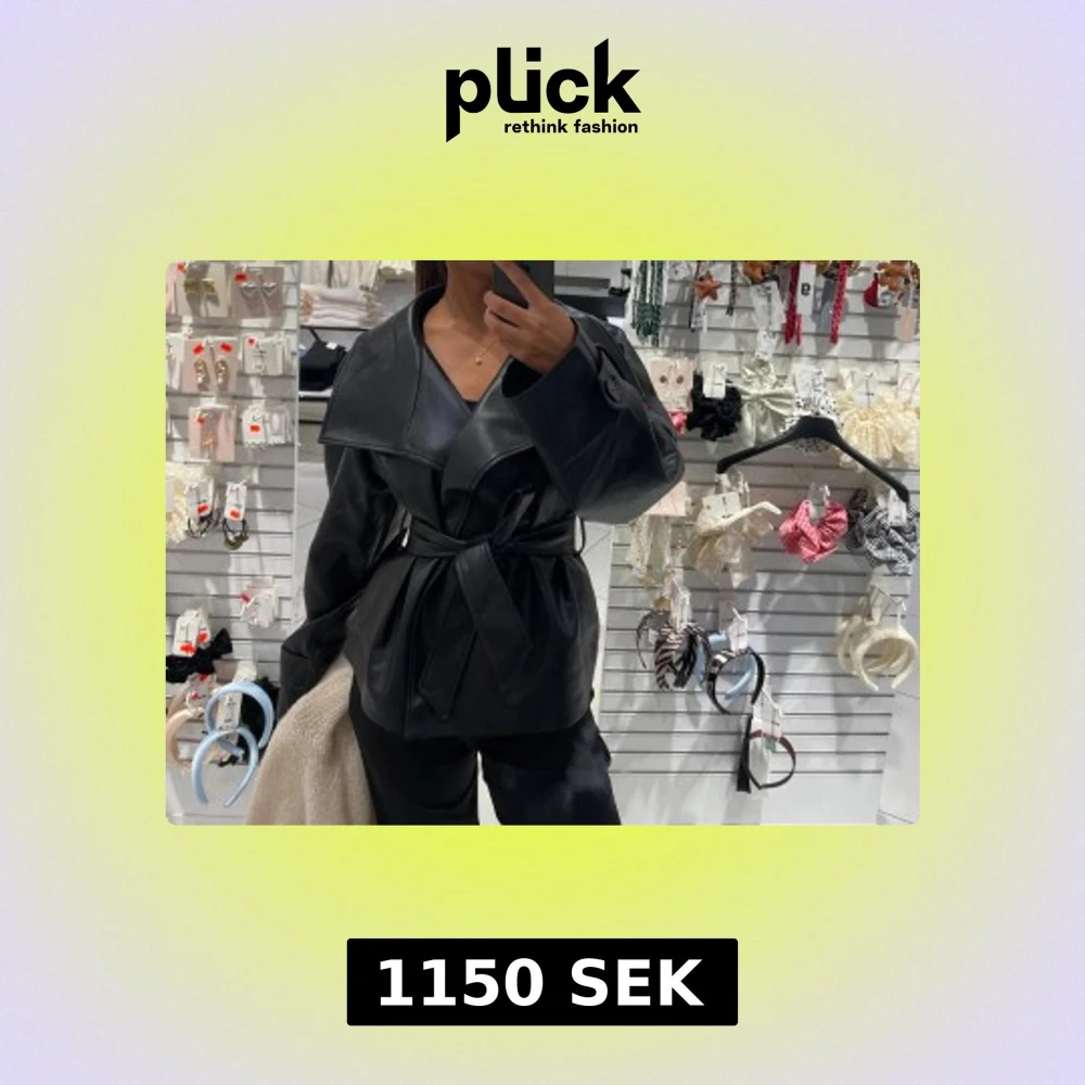 Säljer en svart skinnjacka med bred krage och omlott-design från gina. Jackan har ett matchande bälte i midjan som knyts för att ge en snygg siluett. Materialet är slätt och ger en cool vibe, perfekt för dig som gillar statement-plagg.