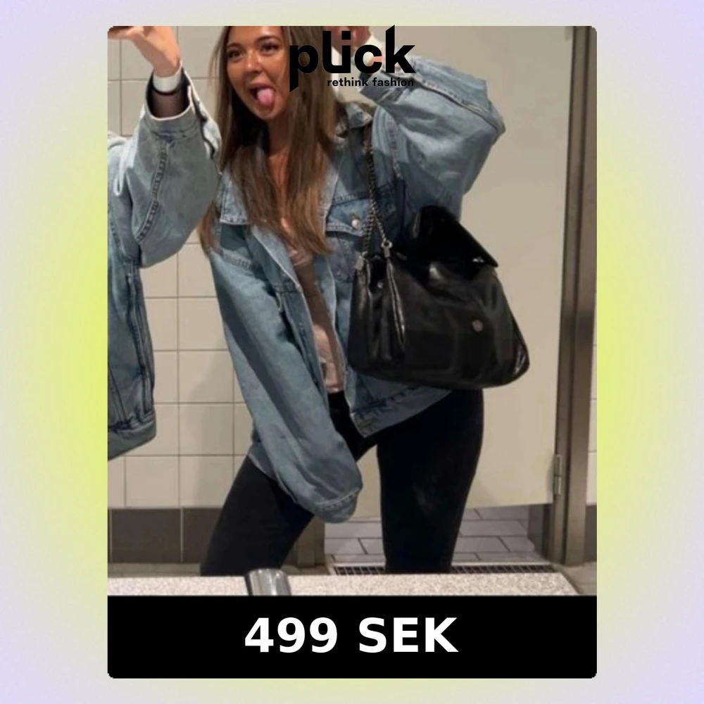 Säljer en oversized ljusblå jeansjacka med klassisk krage och knappar framtill. Jackan har två bröstfickor med lock och knapp samt sidfickor. Perfekt att slänga över en klänning eller till vardagslooken.