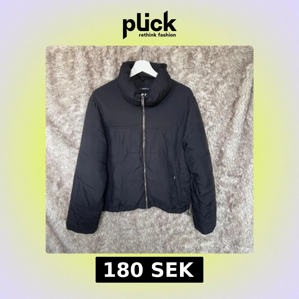 Svart pufferjacka från Gina Tricot med hög krage och dragkedja framtill. Jackan har två fickor med dragkedja. Dragsko i midjan och ärmslut med tryckknappar.