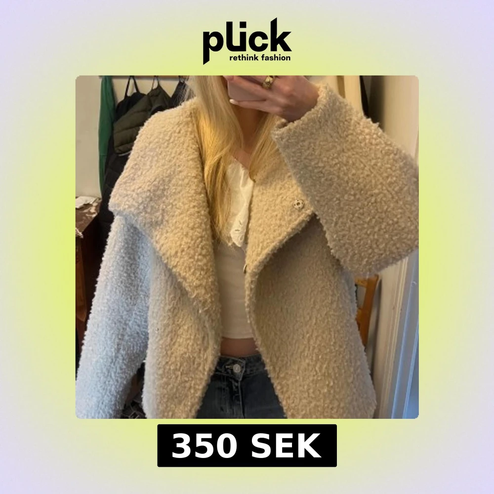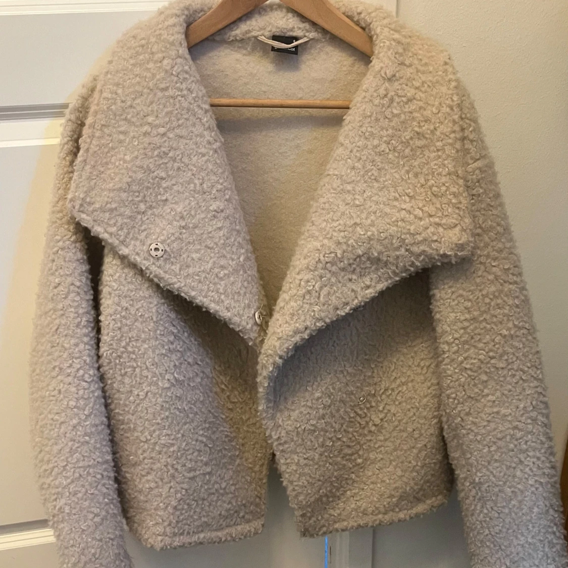 Säljer en beige teddyjacka med stor, bred krage och asymmetrisk knäppning. Jackan är mjuk och fluffig.