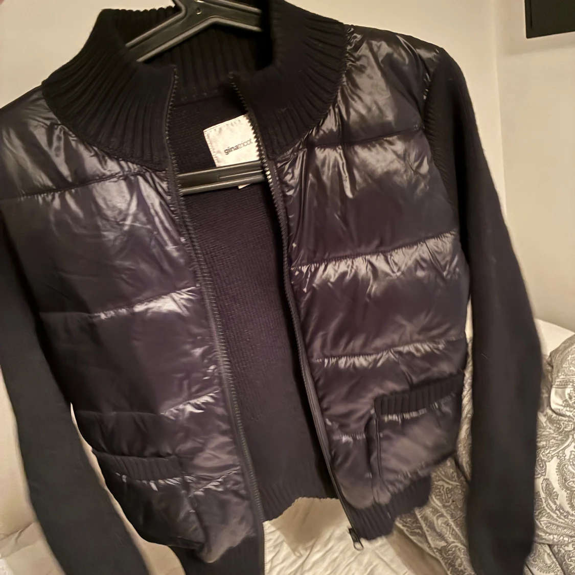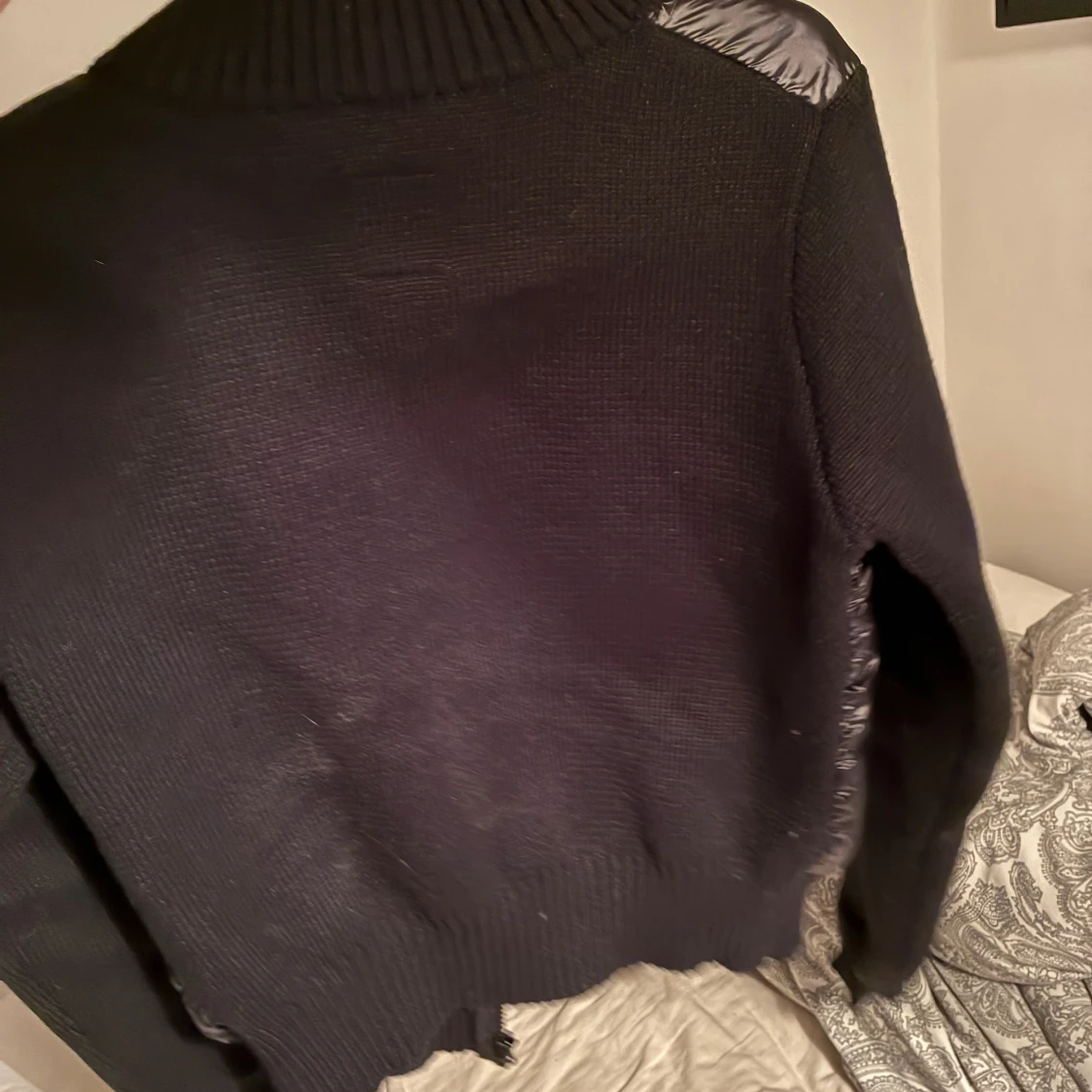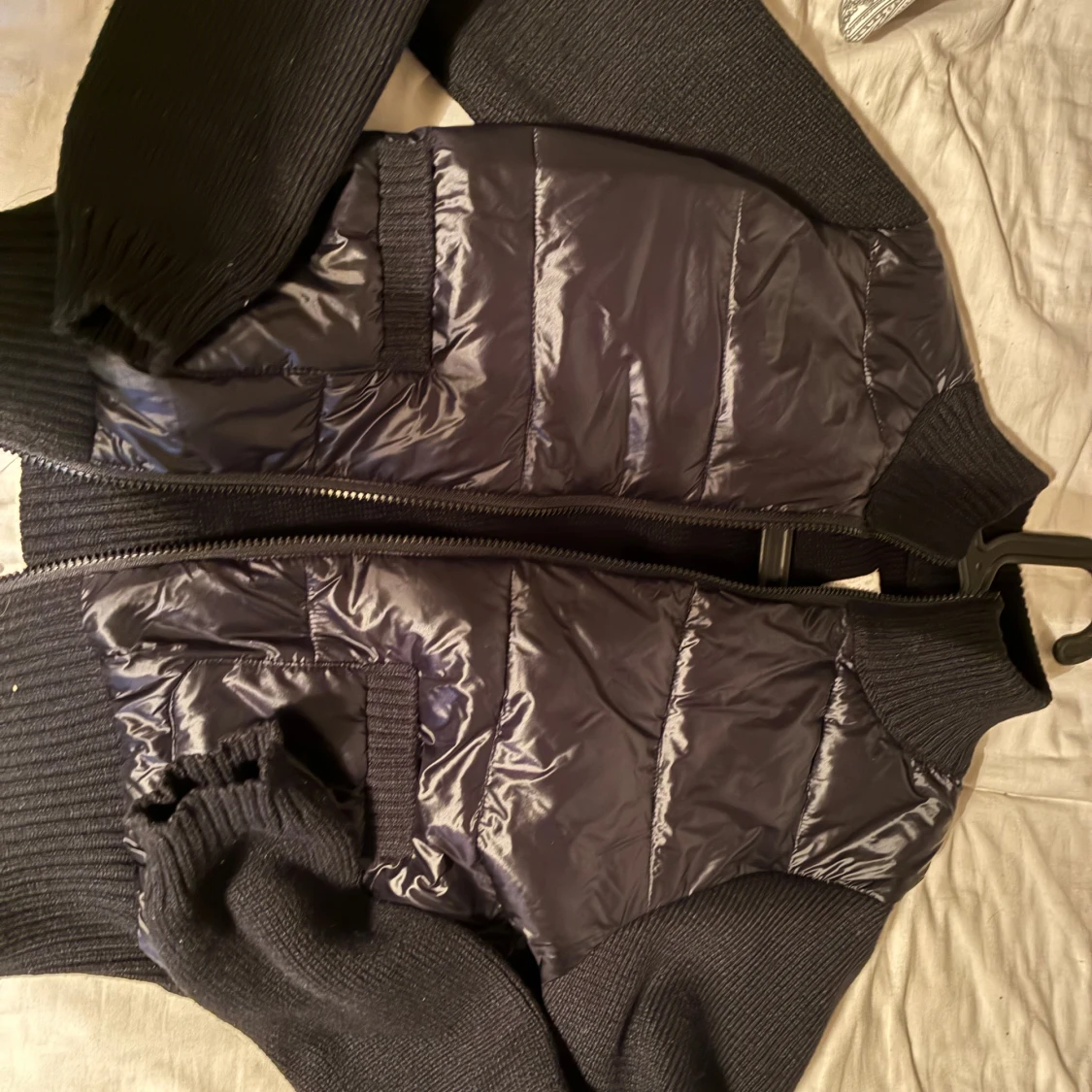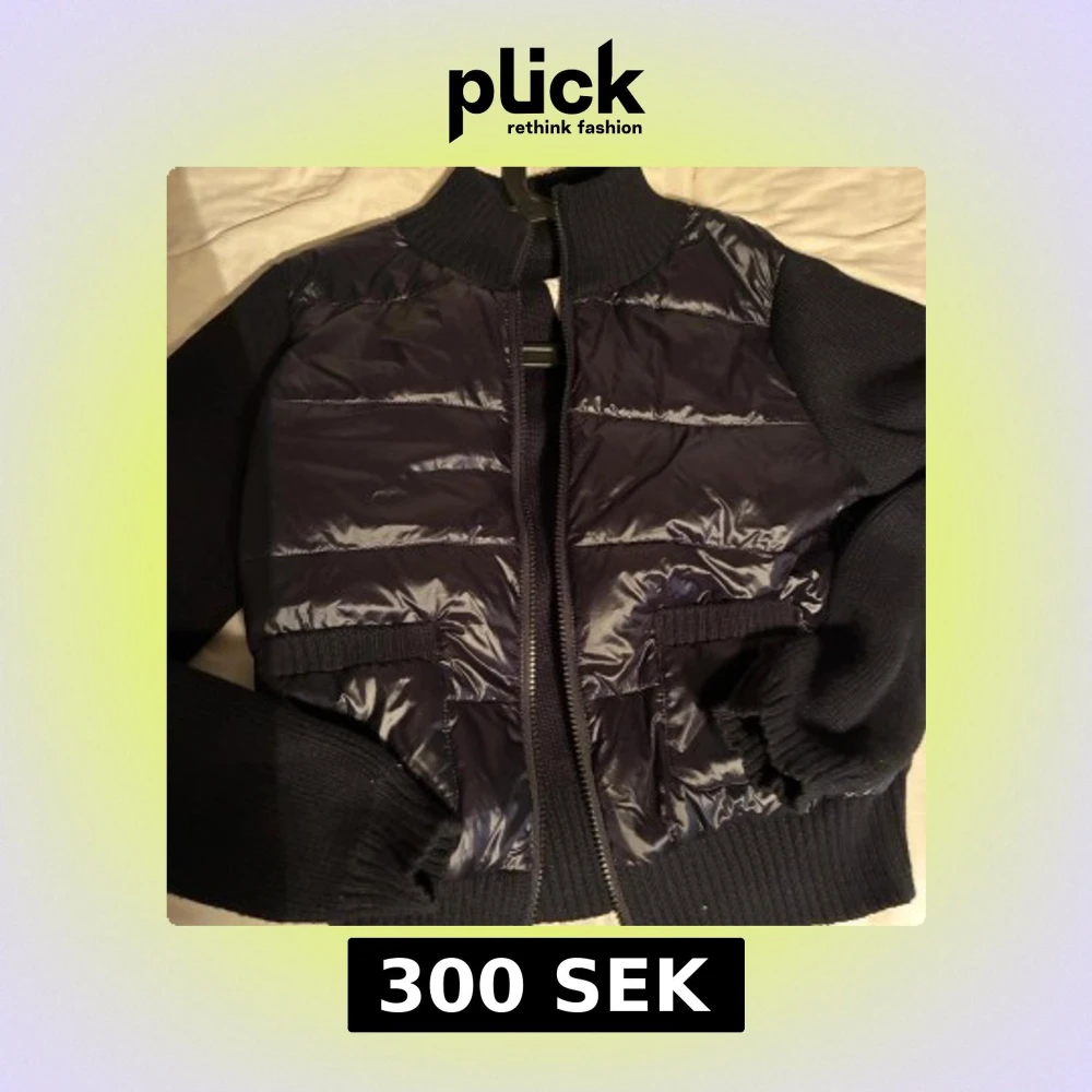 Svart pufferjacka från Gina Tricot med stickade ärmar och rygg. Jackan har ribbad krage, muddar och två fickor framtill. Framsidan är quiltad och glansig medan resten är stickad, vilket ger en cool kontrast. Dragkedja hela vägen fram.