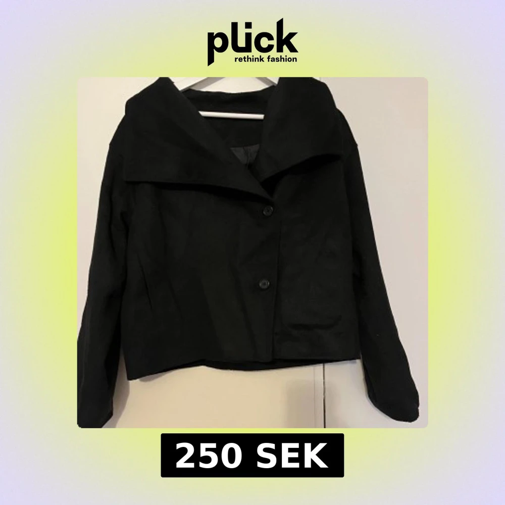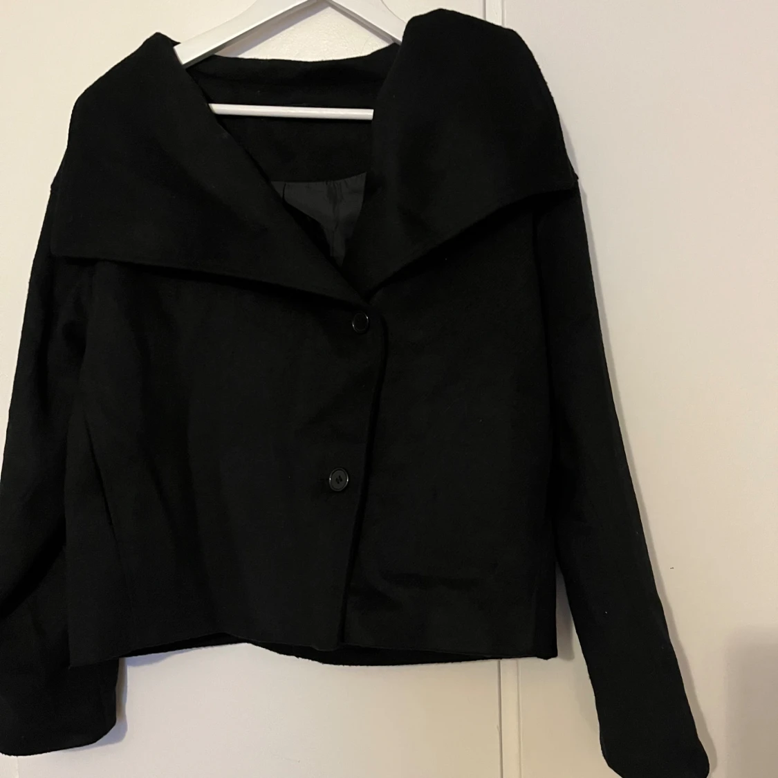 Stilren svart kappa från Gina Tricot med bred krage och två knappar framtill. Jackan har en rak, något croppad passform och är helfärgad utan mönster. Perfekt för dig som gillar minimalistisk och klassisk stil.
