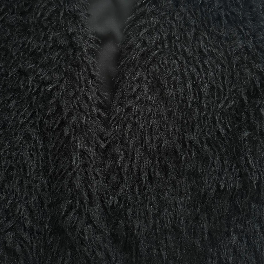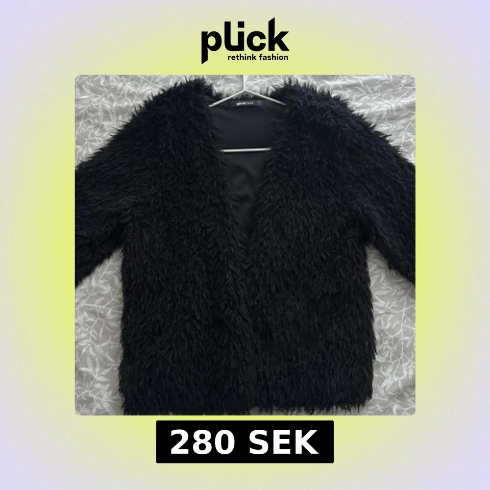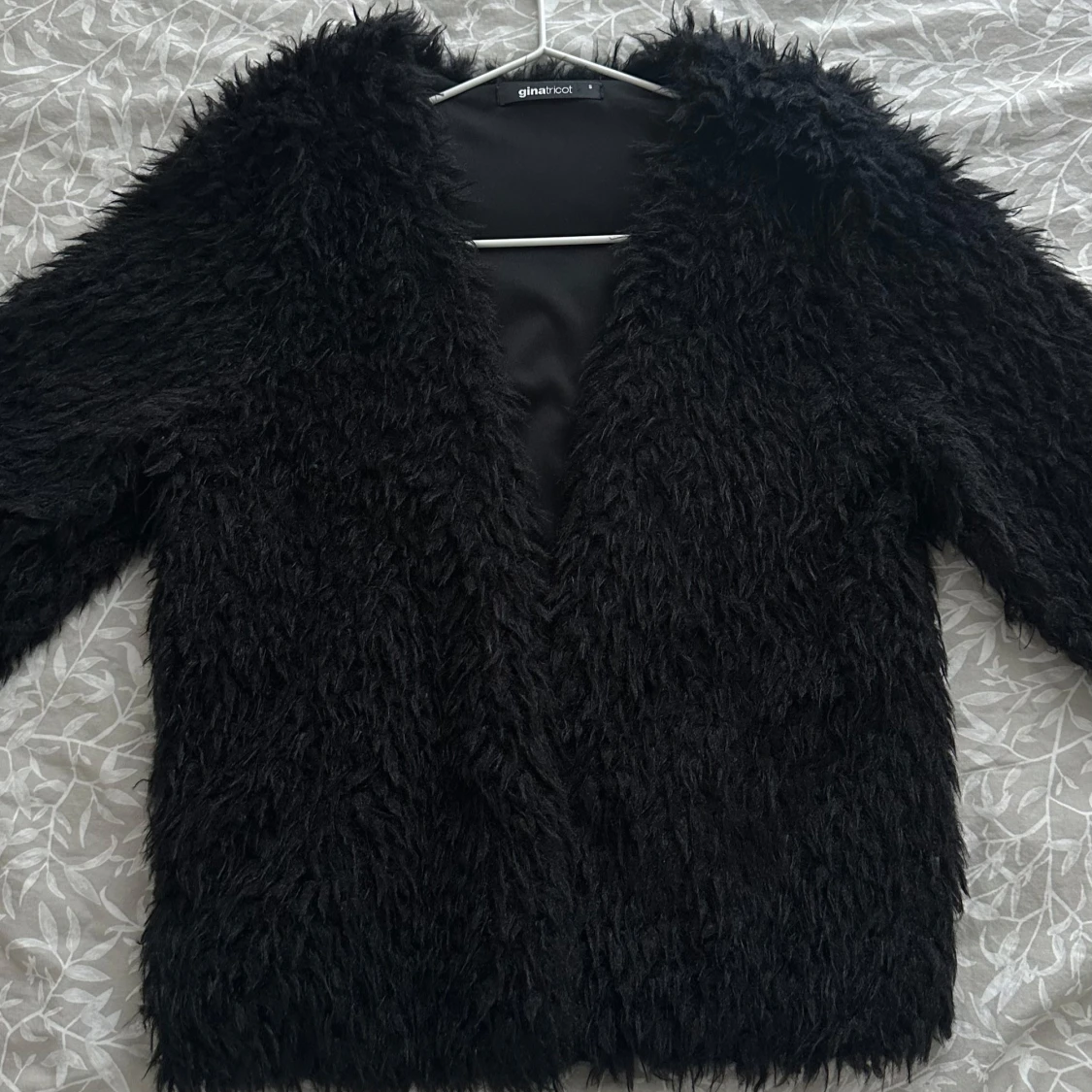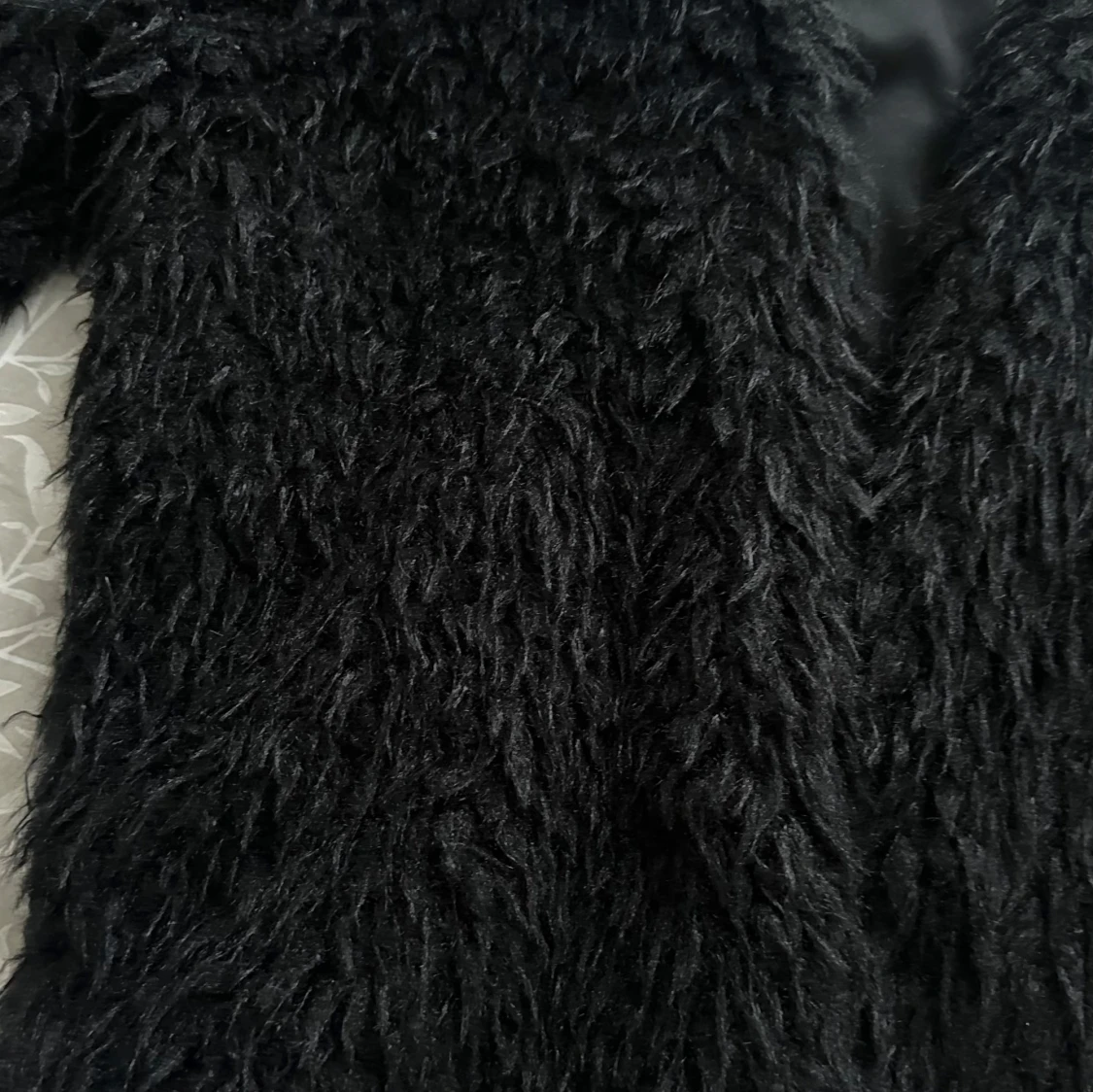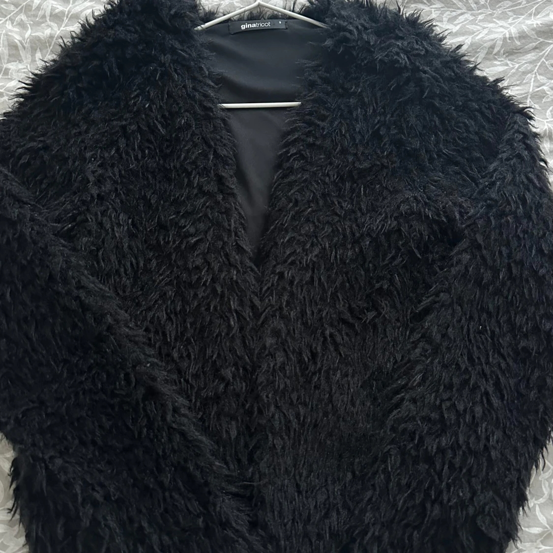 Snygg svart pälsjacka från Gina Tricot. Jackan har en fluffig textur och är perfekt för att hålla dig varm och stilren. Den har långa ärmar och en öppen design utan knappar eller dragkedja. Knappt använd