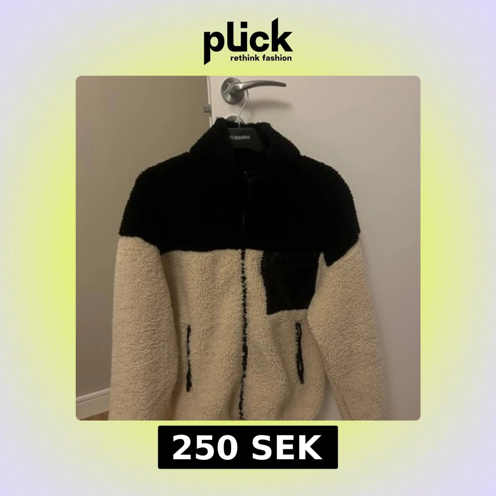 Mysig beige teddyjacka med svarta detaljer från Gina. Jackan har en dragkedja framtill och två fickor med dragkedja. Använd fåtalet gånger.