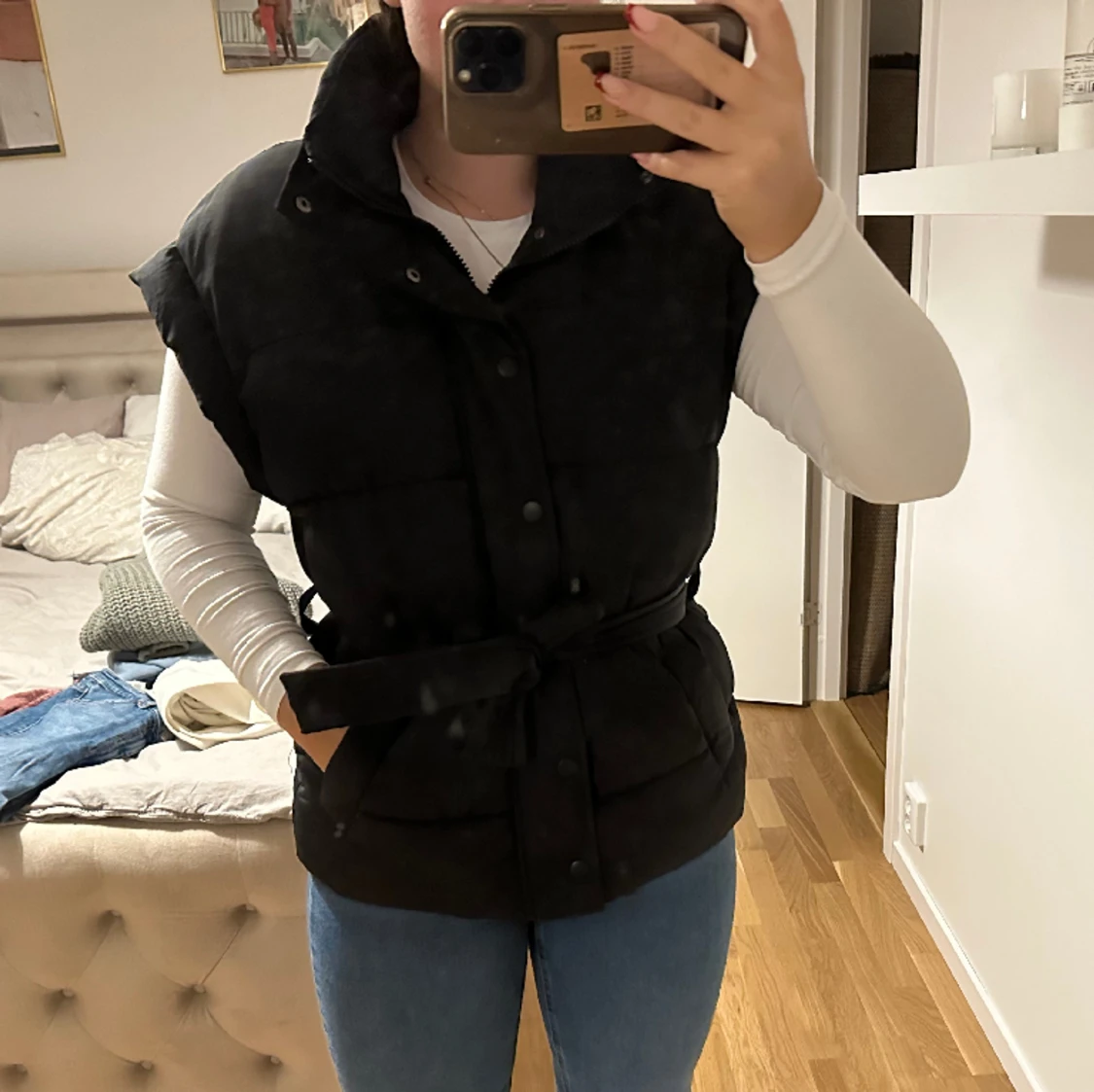 Svart lite tjockare väst med både dragkedja, knappar och snöre, stor i storleken