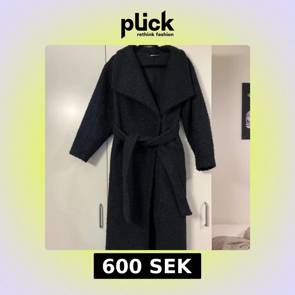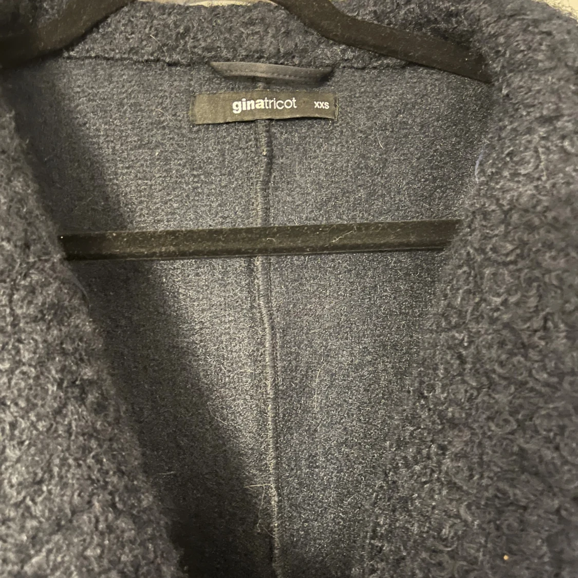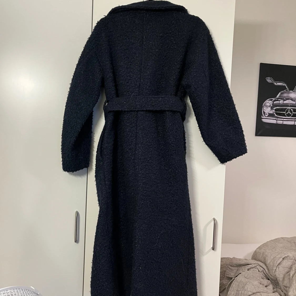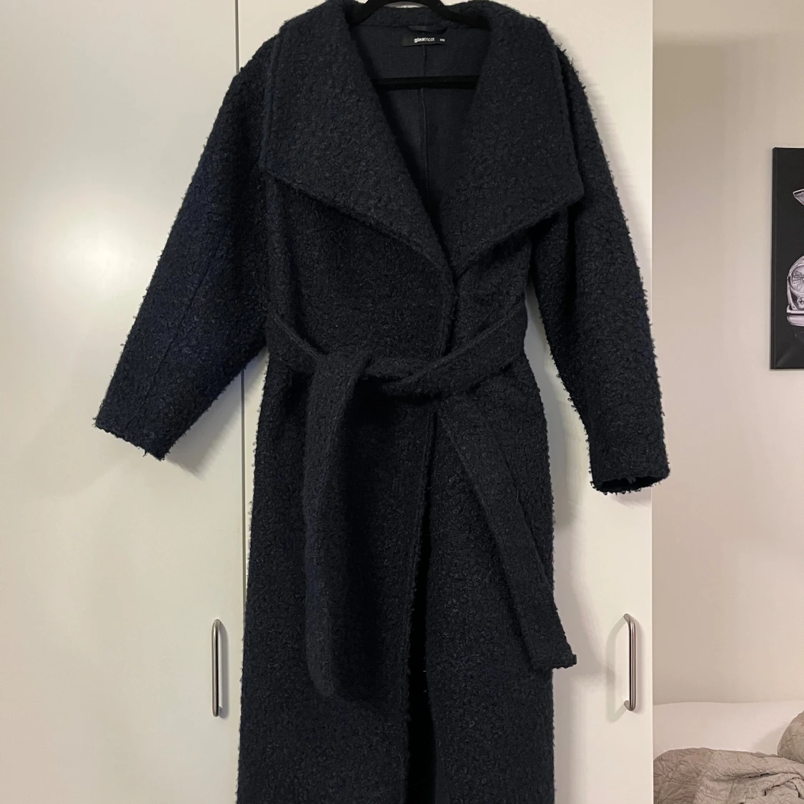 Lång marinblå kappa från Gina Tricot med bälte i midjan och bred krage. Jackan har en mysig, lite fluffig struktur och är perfekt för kyliga dagar. Klassisk och stilren modell som ger en snygg siluett.