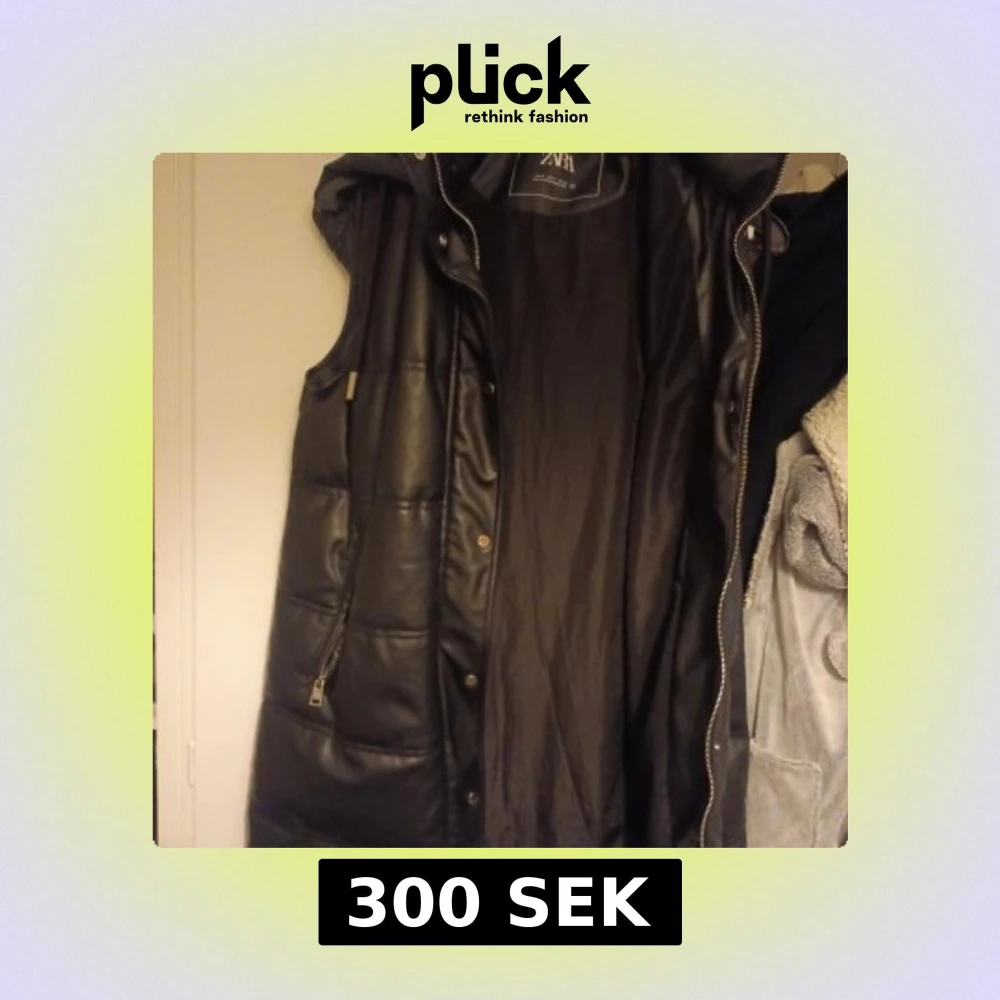 Snygg svart dunväst från Zara med dragkedja och knappar. Perfekt för kyligare dagar med sin quiltade design och huva. Västen har praktiska fickor och en stilren look.