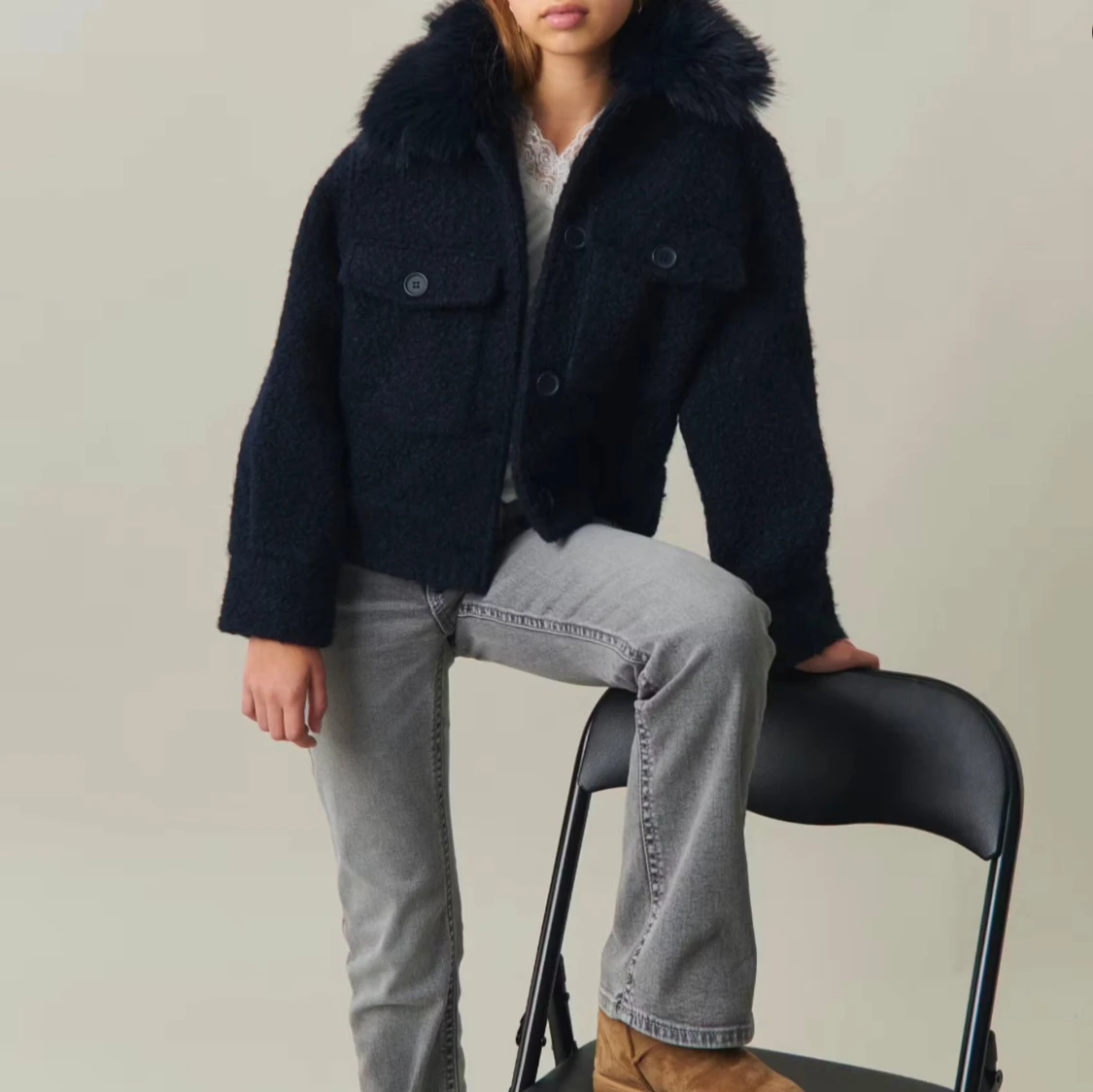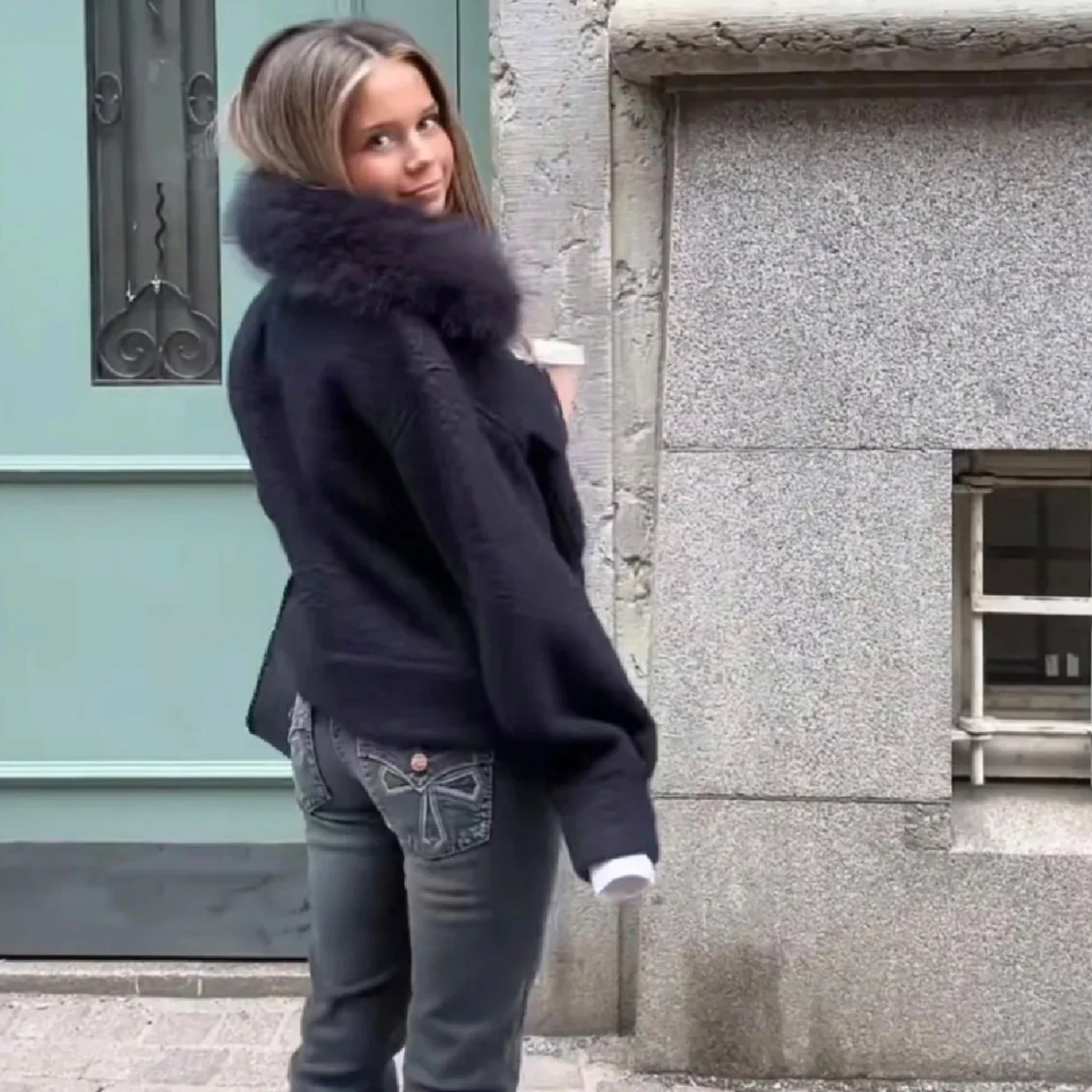 Gina tricot blå jacka med pälskrage