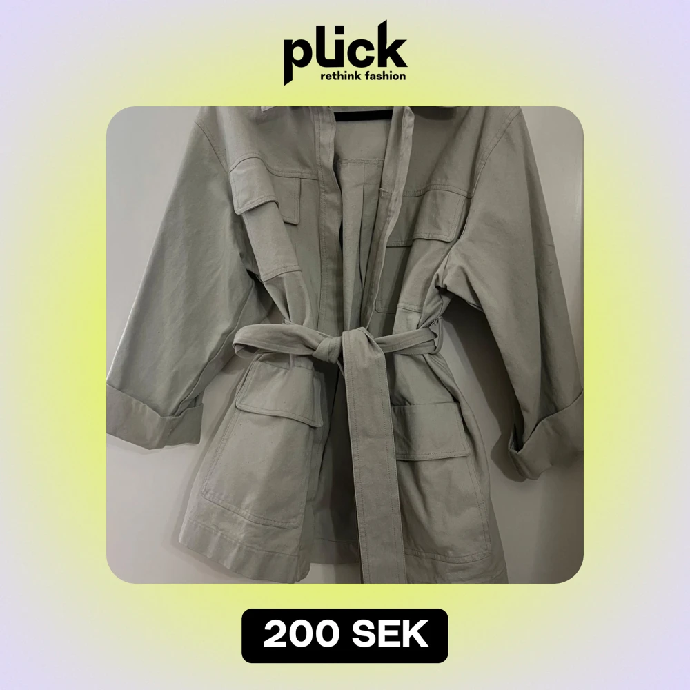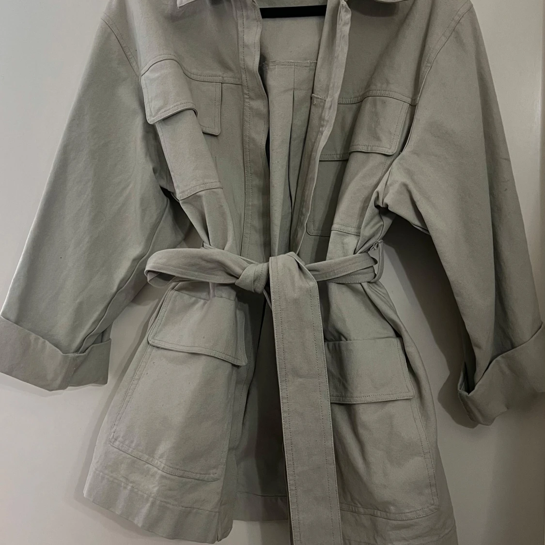 Snygg mintgrön jeansjacka med knytband i midjan och stora fickor framtill. Jackan har en klassisk krage och trekvartsärmar, perfekt för vår och höst. En stilren och mångsidig jacka för alla tillfällen. Köpt på GinaTricot storlek L men passar m/s om man tycker om lite mer oversized stil.
