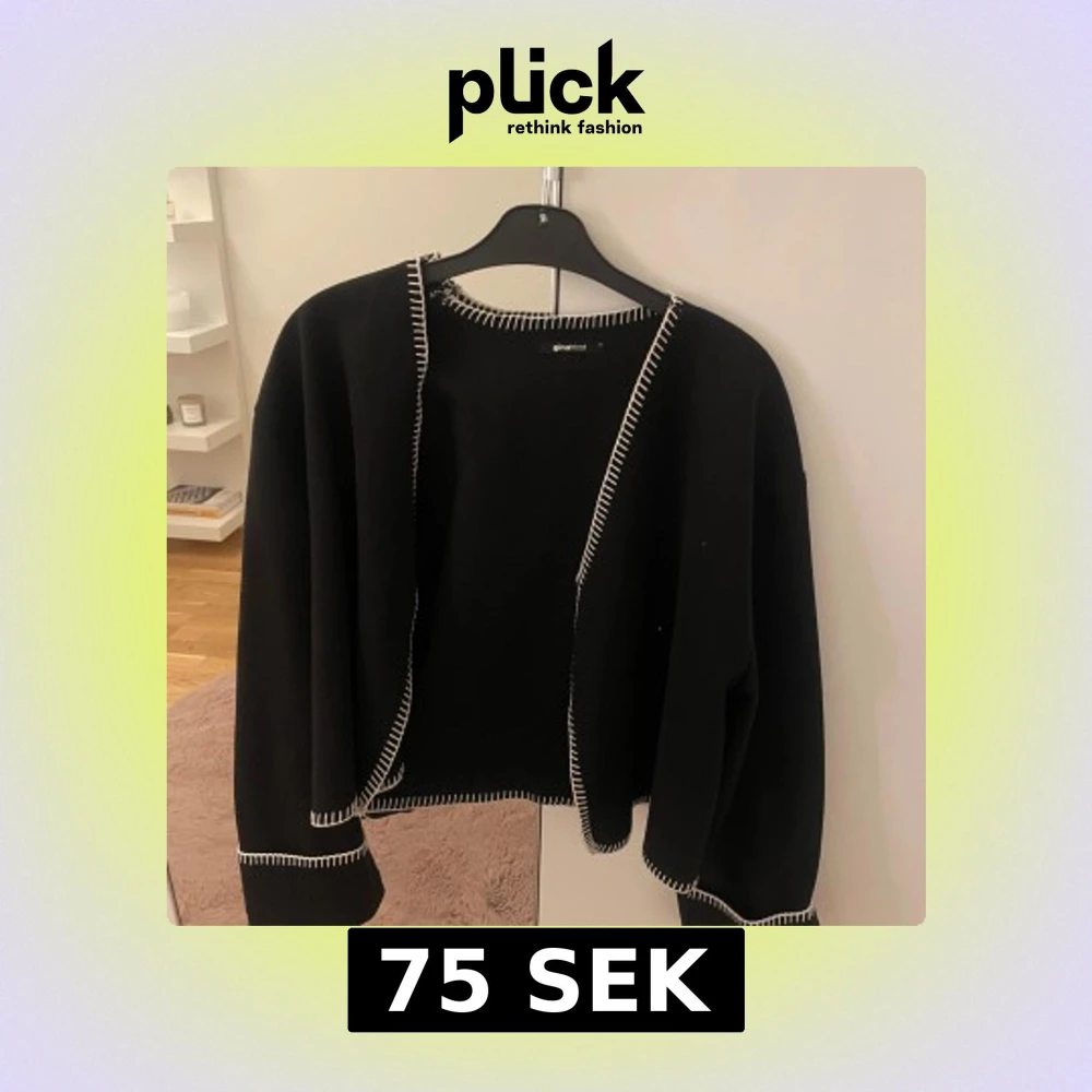 Svart kofta från Gina Tricot med kontrasterande vita sömmar längs kanterna. Koftan har en öppen front och långa ärmar, perfekt för lager-på-lager. Enkel och stilren design som passar till det mesta.