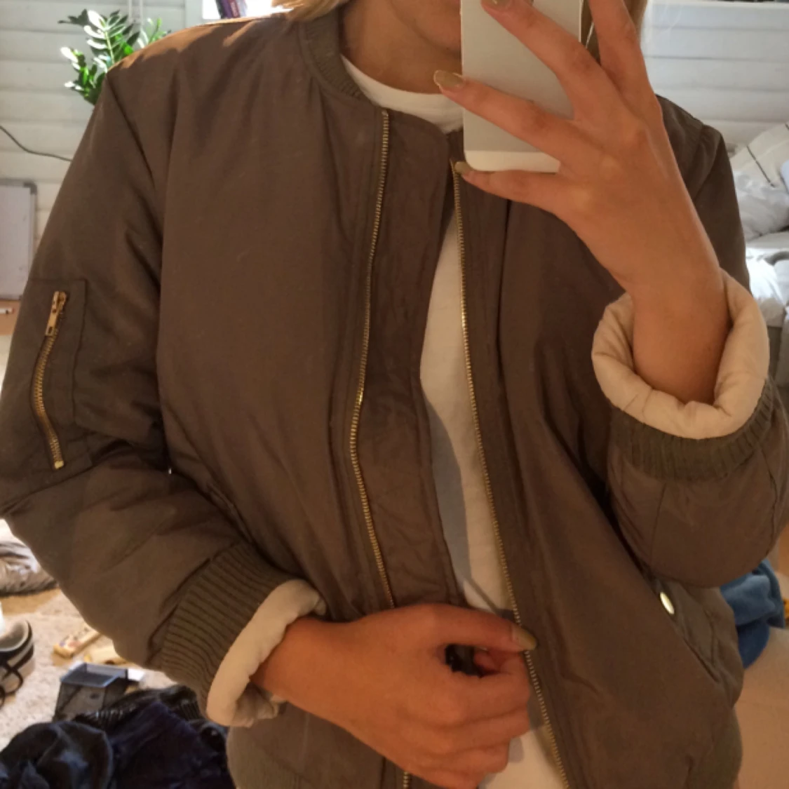 Grön-brun Bomberjacka med guldiga detaljer. Jacka är inköpt för något år sedan, sparsamt använd. Finns att hämta i Stockholm alternativt fraktas mot en fraktkostnad. Från ett djur och rök-fritt hem.