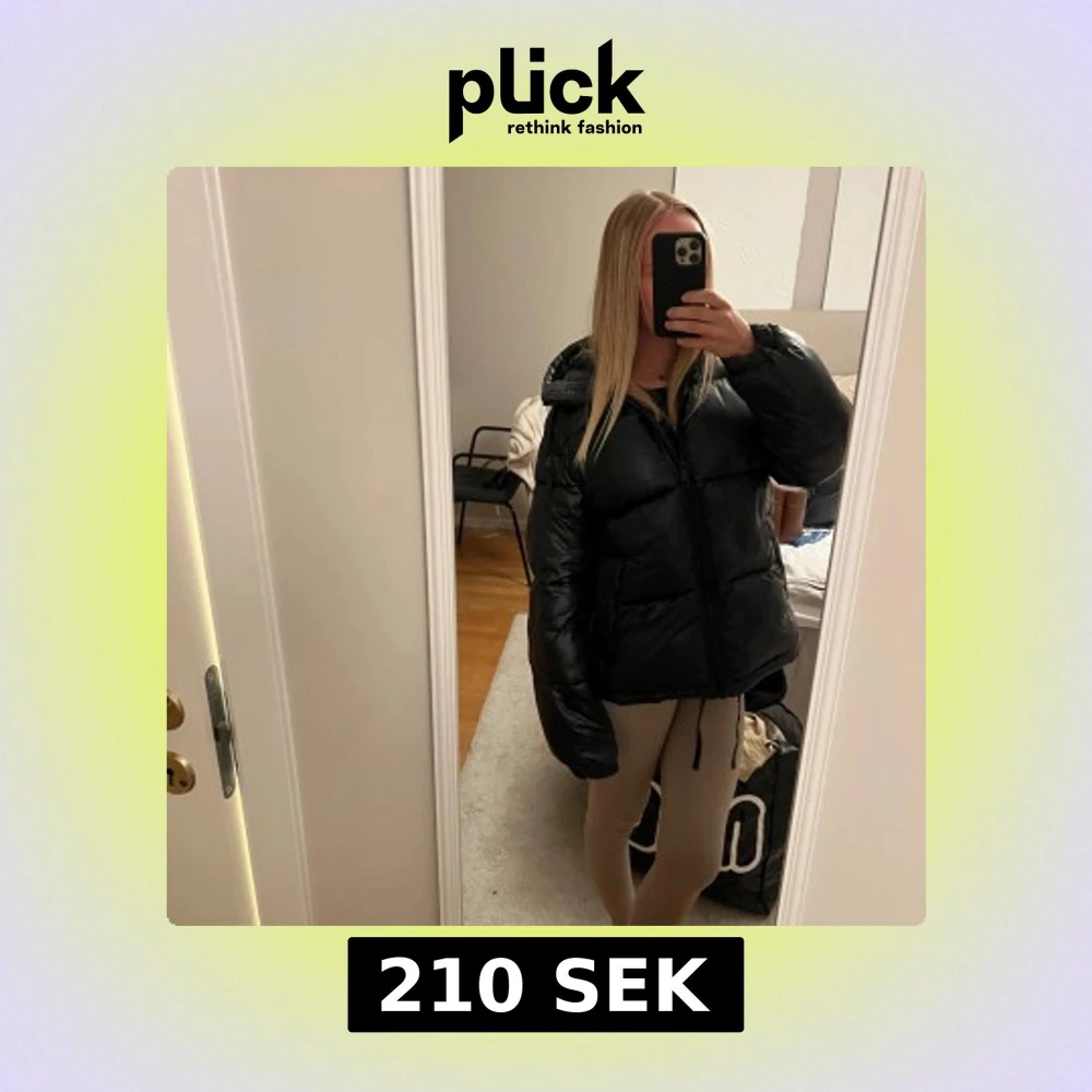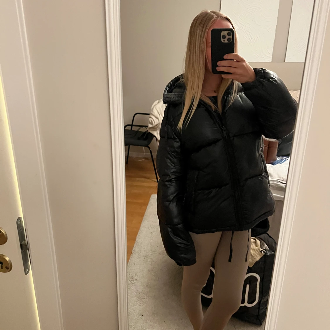 Säljer en svart pufferjacka med huva och dragkedja framtill. Jackan har en oversized passform och är perfekt för kalla dagar. Den är tillverkad i ett glansigt syntetmaterial och har långa ärmar. Snygg och trendig stil som passar till många outfits.
