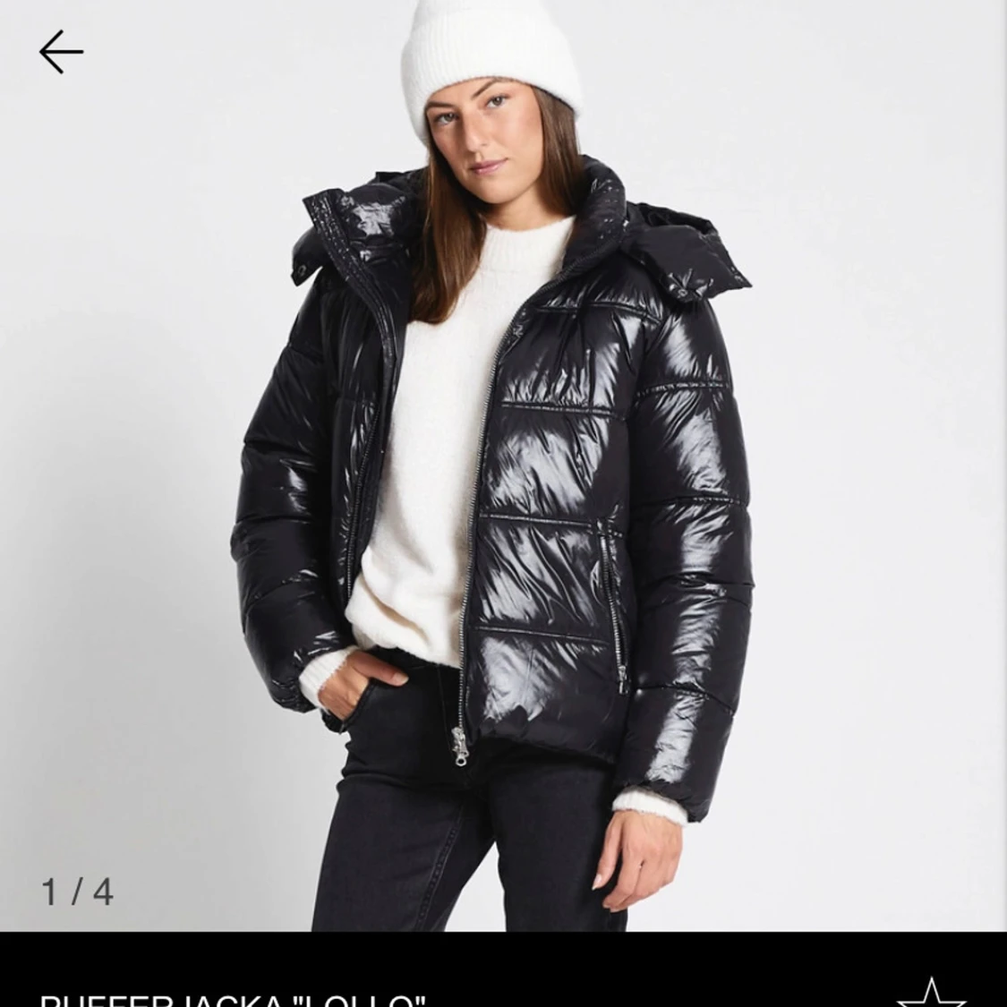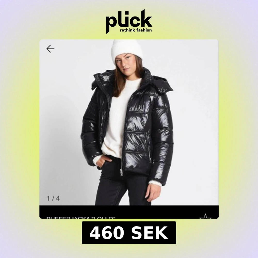 Snygg svart pufferjacka med glansig yta och huva. Jackan har dragkedja framtill och är perfekt för kyliga dagar. Den är långärmad och har en modern look. Helt ny prislapp sitter kvar säljes pga fel storlek