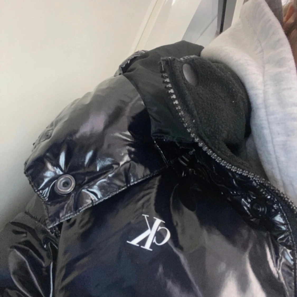 Snygg svart glansig pufferjacka från Calvin Klein med dragkedja och knappar. Perfekt för kyliga dagar med sin stilrena design och varma material.