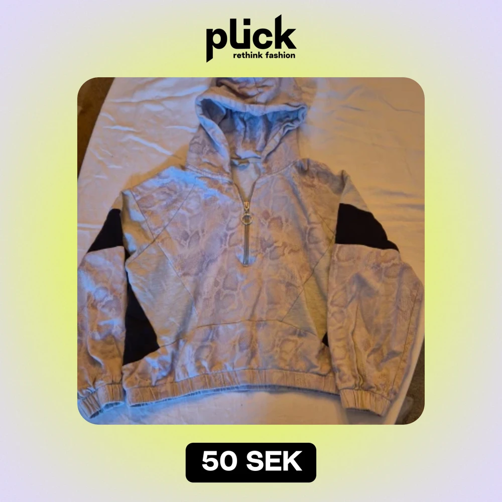 Säljer en grå hoodie med svart mönster och dragkedja framtill. Den har en cool ormskinnsdesign och en praktisk huva. Perfekt för vardagsbruk och håller dig varm och bekväm. Passar barn i storlek 134/140.