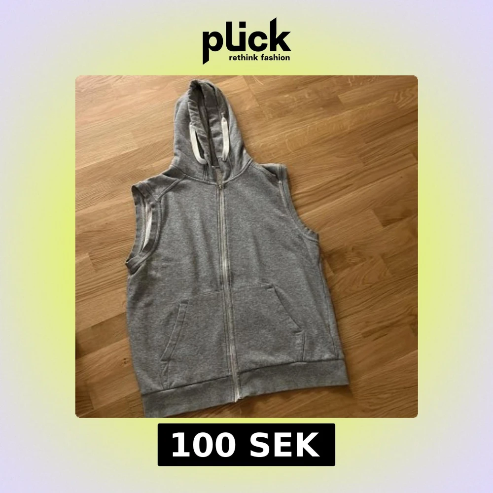 Grå väst med huva och dragkedja framtill. Ärmlös modell med två stora fickor på magen och vita snören i huvan. Perfekt för en avslappnad och sportig stil.